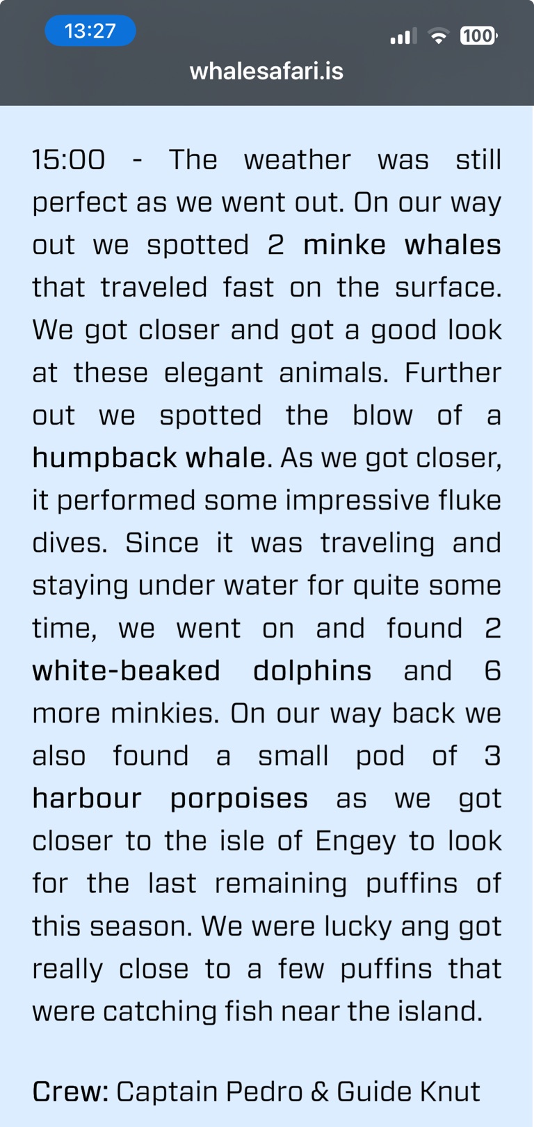 - Reykjavik: Whale watching tour via jet boat in Faxafloi Bay. If in summer, be sure your includes “Puffins.” We rec Whale Safari.