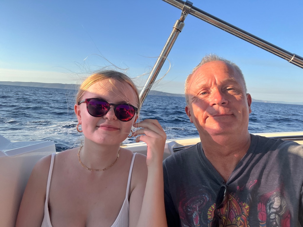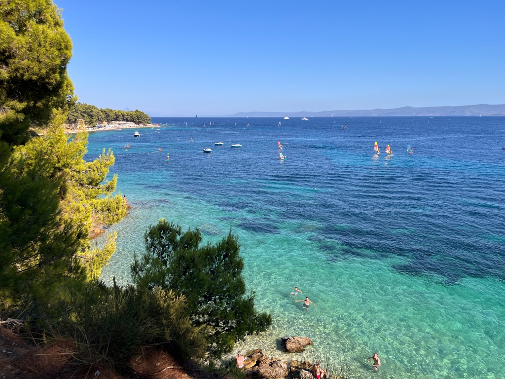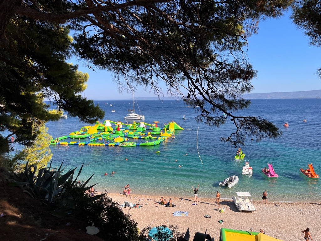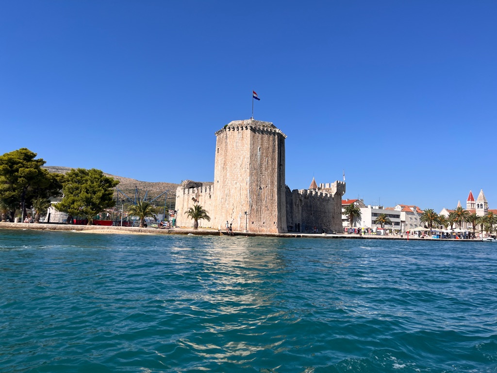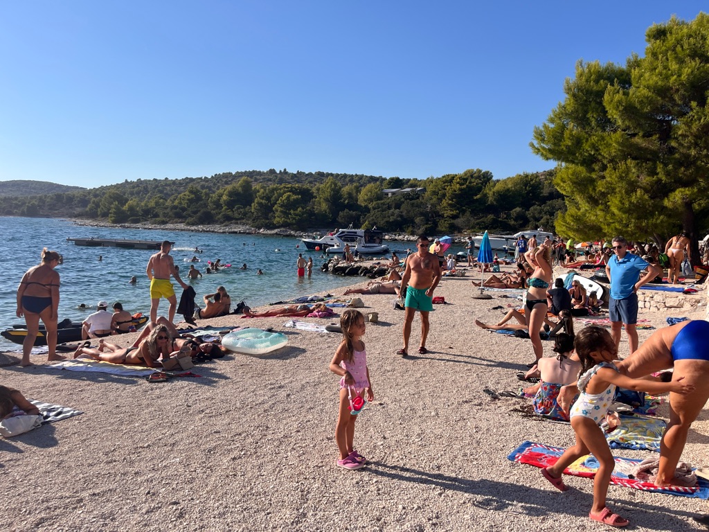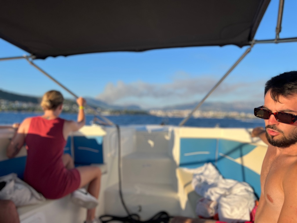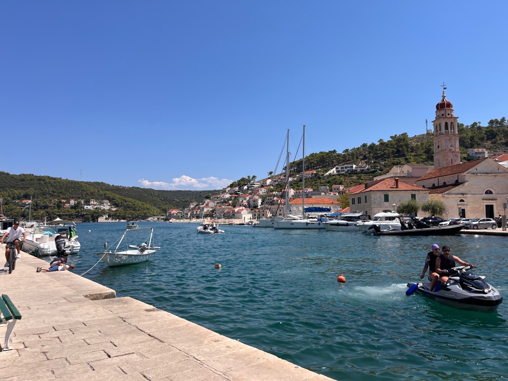 20 minute fast boat ride to UNESCO town of Trogir. Went directly to restaurant on waterfront for late lunch and drinks. Spent most of the allotted 1 hour on the phone to Franc and Mel who were inspecting 213. Back on the boat for a fast ride to the Blue Lagoon for another allotted hour. Looked like Cabo on Spring Break so Sasha and I went to sit on concrete jetty far from the madding crowd. Another 20 minute boat ride to a beach bar on Ciovo Island. Crammed full with bar/beachgoers, so Sasha and I got drinks and went to sit on our own. Back on the speedboat for the 20 minute ride back to Split.