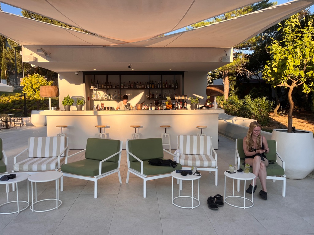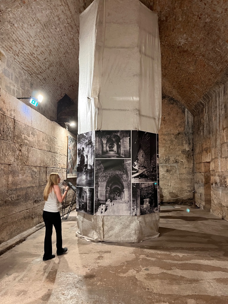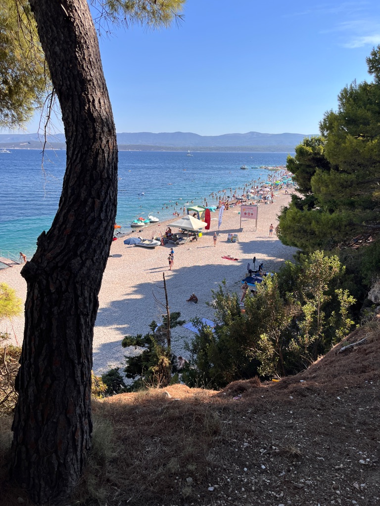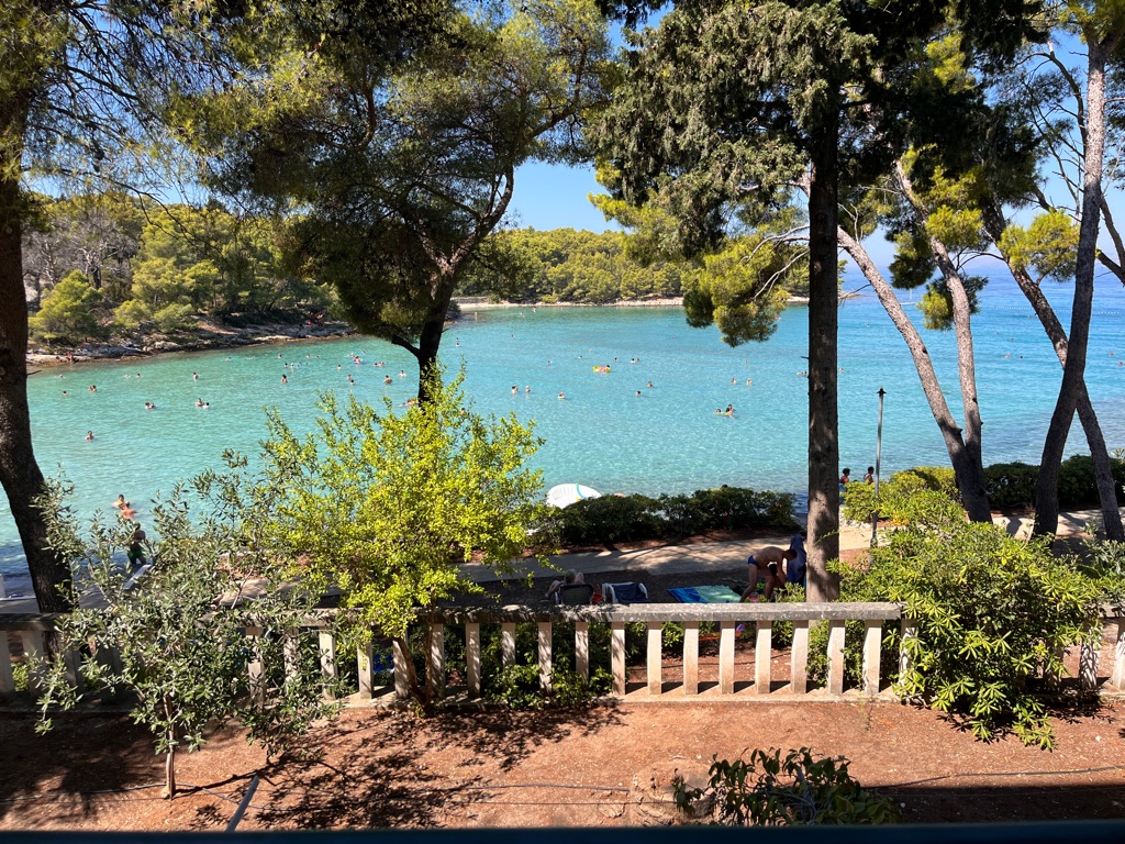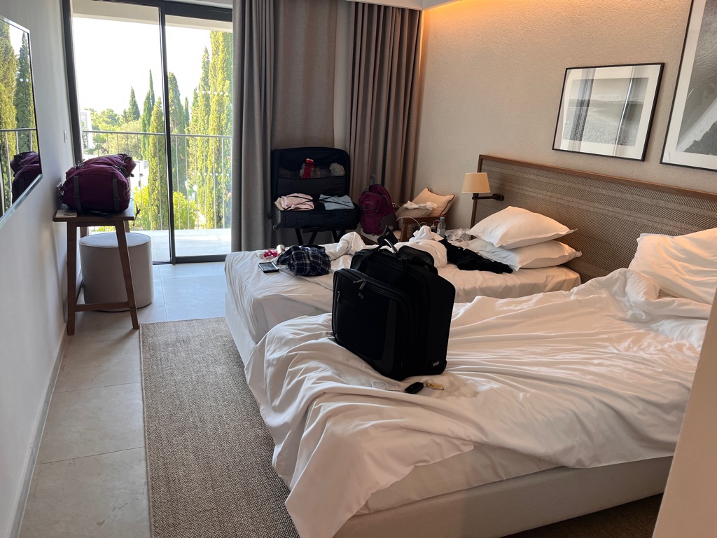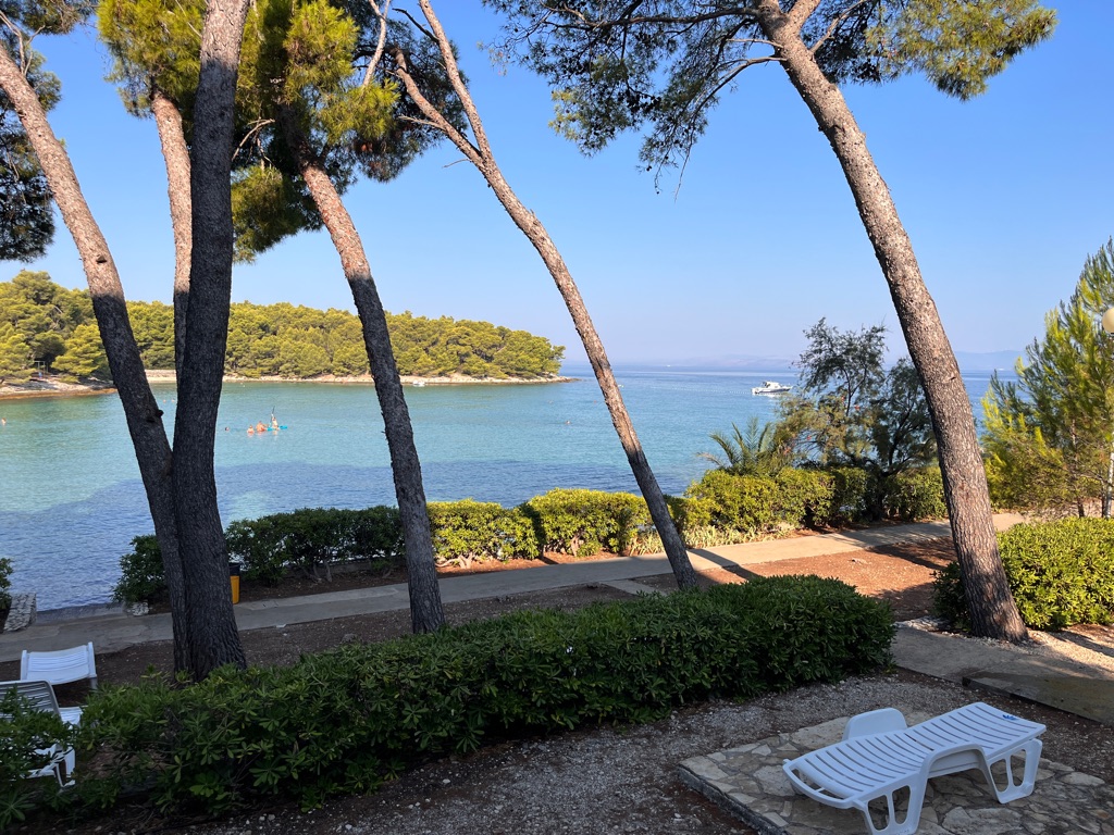 Packing up to move on to Brač. Got pastries from place around the corner and realized we were not going to make the 11.15am ferry. Decided to walk to the palace to kill some time and found the cellars of Diocletian’s palace, so paid to do the self-guided tour. Back to Seabed to say goodbye and collect bags for the walk to the Supetar ferry, aiming for the 12.45pm departure. Easy boarding. Took refuge in the inside seating area and got some drinks. 50 minute ride to Supetar. Disembarked very busy ferry (thankful for elevator) and found taxi at port side who wanted €20 to get to Labranda Velaris Resort. Walked off port and found a taxi for €15. A few minute ride to the resort. Golly, topless woman by the pool!