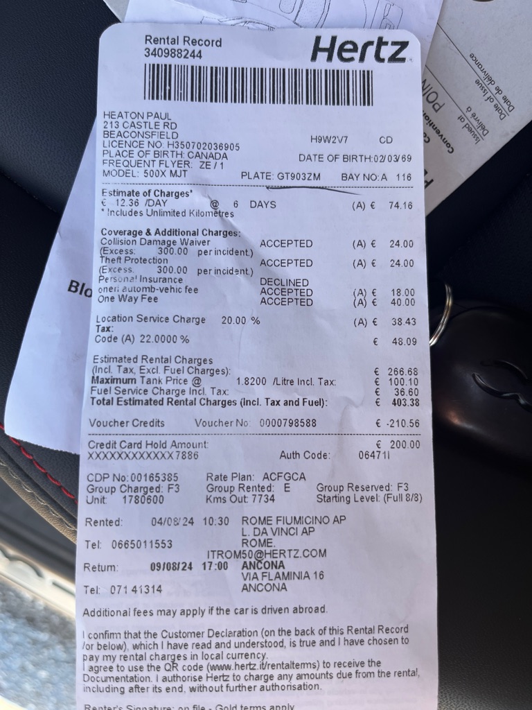 Early flight arrival. Baggage took forever. Followed signs for Terminal 1 to eventually collect a Fiat 500 Sport from Hertz Gold.
