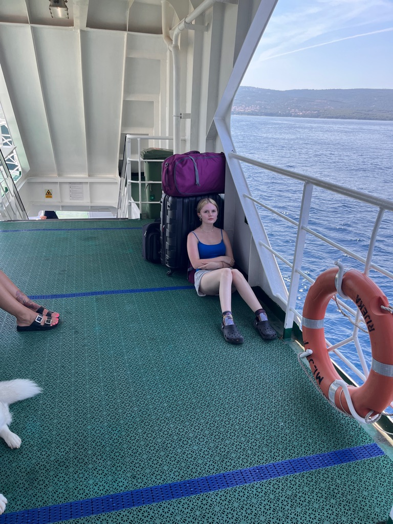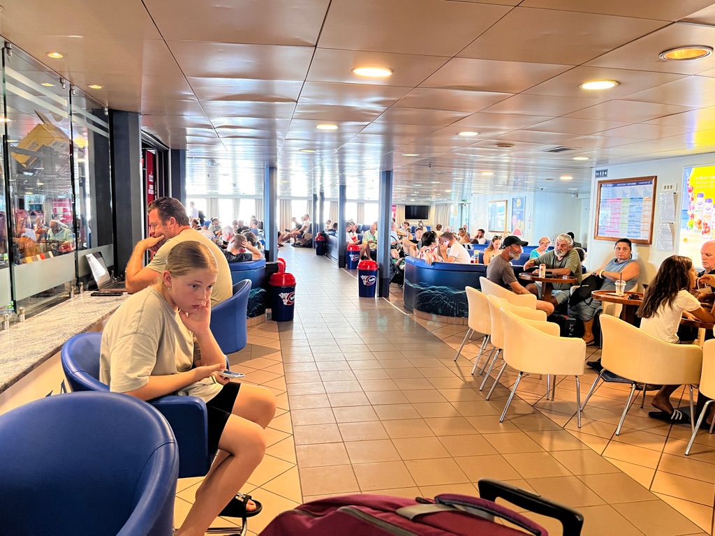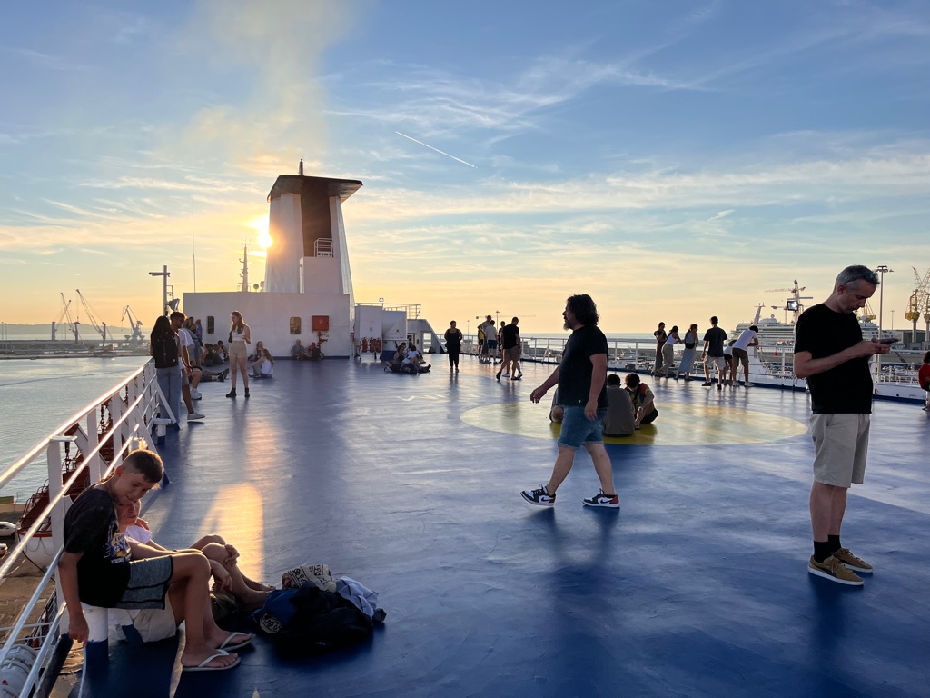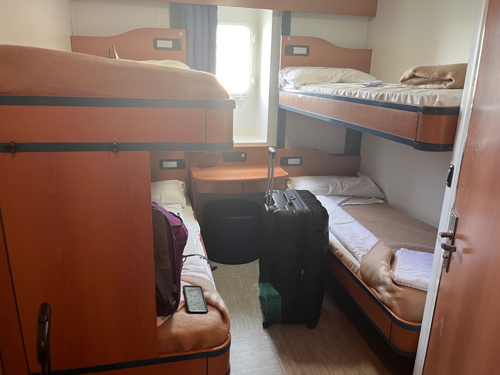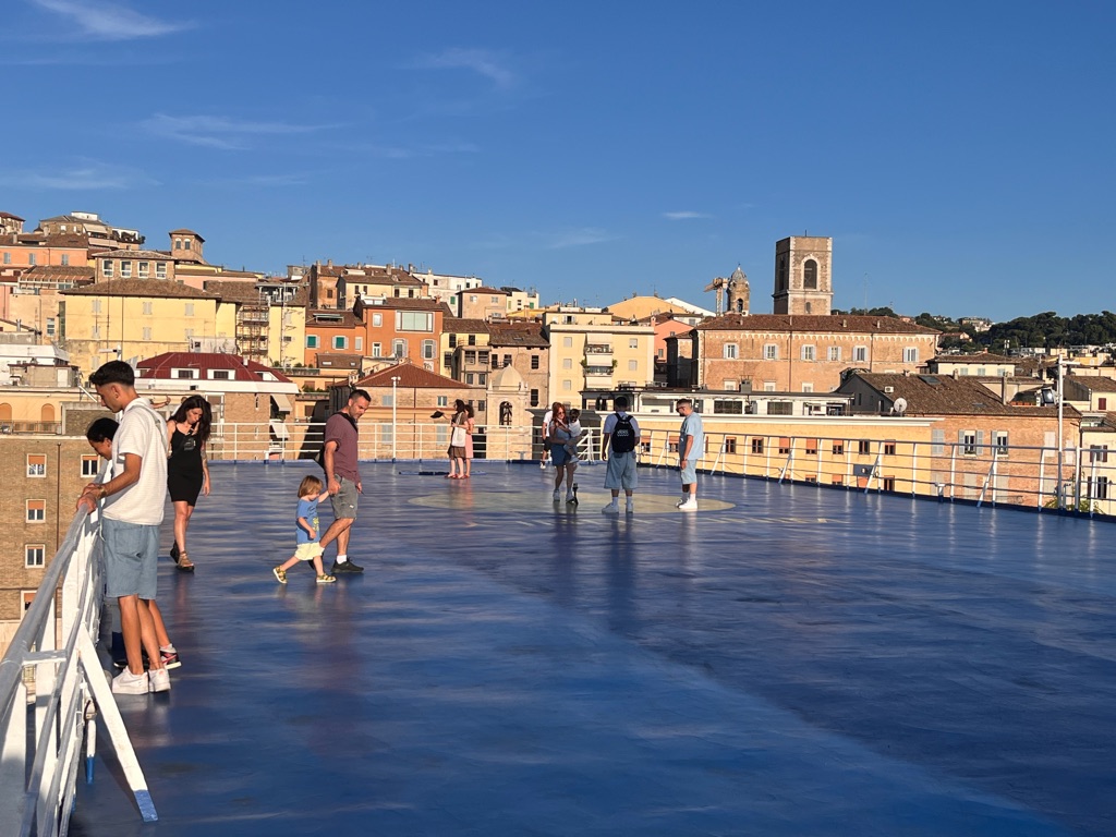 Got to the Ancona Ferry Port ticket office/checking in facility around 1.30 and collected pre-purchased tickets for SNAV Aurelia ferry to Split, plus 7 hours of wiffy access for €10. My iphone then crashed which Sasha was able to reset. Next, refuelled the scratched Fiat 500 with diesel (only fill up during 6 days) and then found some place called the Colorado Cafe for a prosciutto sandwich and coke each. Drove to Hertz office opposite station only to find it closed. Parked car outside and had to buy parking ticket valid to when Hertz opened again. No transport back to port so called a can company that didn’t speak English. No obvious cabs around so walked to train station realizing they normally have a taxi rank. Taxi turned up a few mins later and thankfully got backll to the Ancona Ferry Port ticket office/check in to get the shuttle bus #20 to the port. Loads of people arriving for evening ferries. Now around 4.15pm. Didn’t get off the bus at port #11 due to lack of instruction and being sat at the back and blocked by other passengers. Had to stay on bus to do round trip again, eventually getting off bus at passport control area. Then spent +1hr waiting in queue for the customs to open (had been told ferry boarding started at 4.00pm). Hot and sweaty. Easy passage through customs with no bag checks or scans before finally dragging ourselves and bags onto the ferry (thankfully equipped with escalators). Got room key from Reception plus wifi code and thankfully cabin (with double bunk beds) was there to greet us, air conditioning and all.