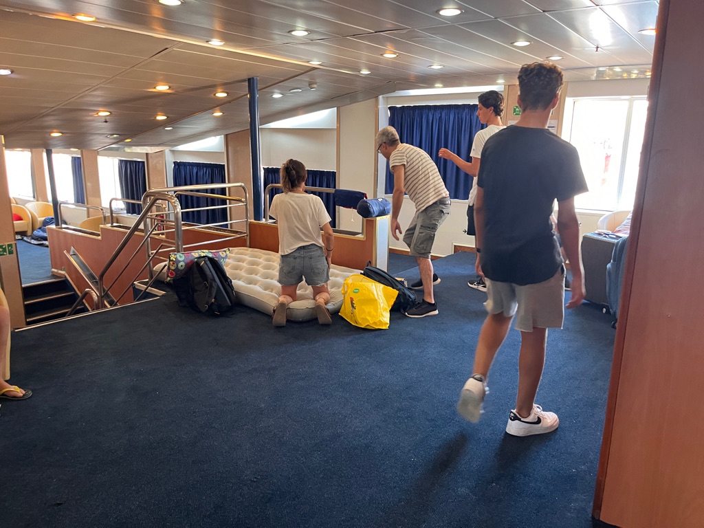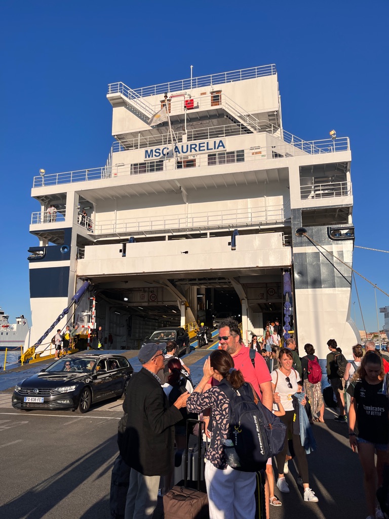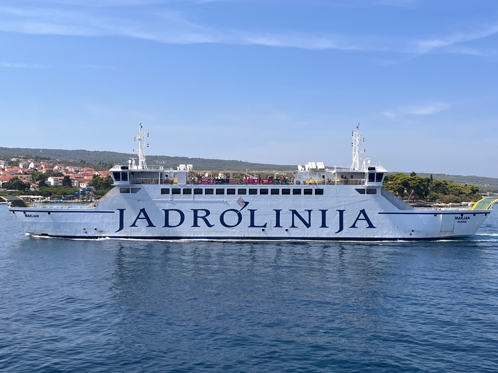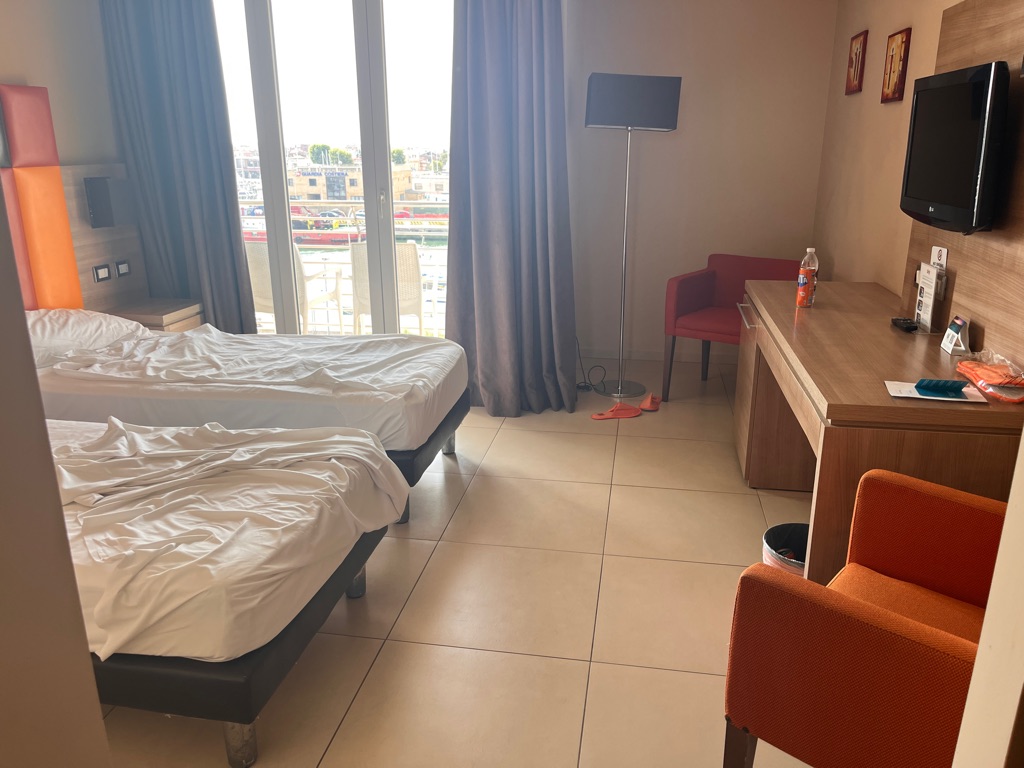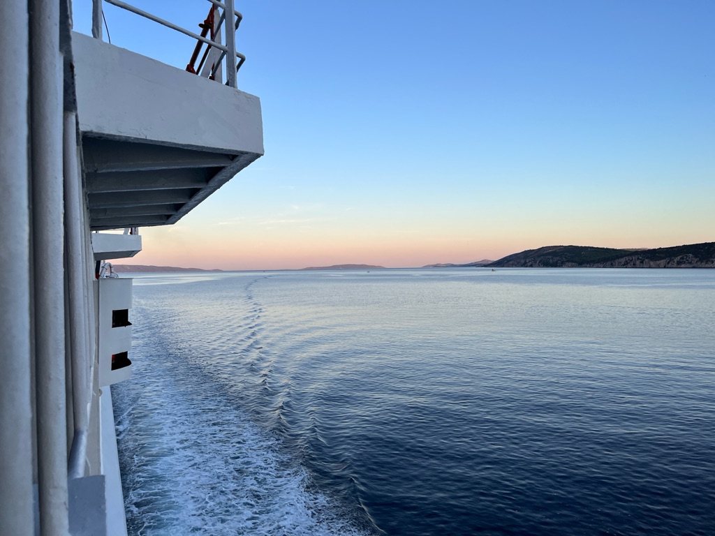Got to the Ancona Ferry Port ticket office/checking in facility around 1.30 and collected pre-purchased tickets for SNAV Aurelia ferry to Split, plus 7 hours of wiffy access for €10. My iphone then crashed which Sasha was able to reset. Next, refuelled the scratched Fiat 500 with diesel (only fill up during 6 days) and then found some place called the Colorado Cafe for a prosciutto sandwich and coke each. Drove to Hertz office opposite station only to find it closed. Parked car outside and had to buy parking ticket valid to when Hertz opened again. No transport back to port so called a can company that didn’t speak English. No obvious cabs around so walked to train station realizing they normally have a taxi rank. Taxi turned up a few mins later and thankfully got backll to the Ancona Ferry Port ticket office/check in to get the shuttle bus #20 to the port. Loads of people arriving for evening ferries. Now around 4.15pm. Didn’t get off the bus at port #11 due to lack of instruction and being sat at the back and blocked by other passengers. Had to stay on bus to do round trip again, eventually getting off bus at passport control area. Then spent +1hr waiting in queue for the customs to open (had been told ferry boarding started at 4.00pm). Hot and sweaty. Easy passage through customs with no bag checks or scans before finally dragging ourselves and bags onto the ferry (thankfully equipped with escalators). Got room key from Reception plus wifi code and thankfully cabin (with double bunk beds) was there to greet us, air conditioning and all.