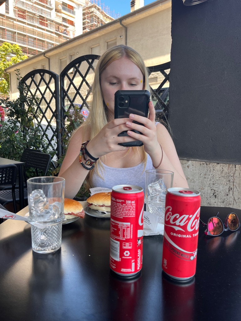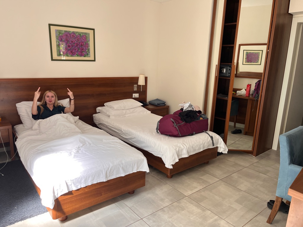 Checked in, got room 308 with a balcony and 2 single beds. Just as warm in Rome as Split except cloudier. Cleaned up and whatnot before deciding to go to the hotel’s ‘T41’ restaurant, despite the mostly fish menu. Sasha has a cheeseburger without cheese and I had a chicken caesar salad, neither of which were particularly inspiring.