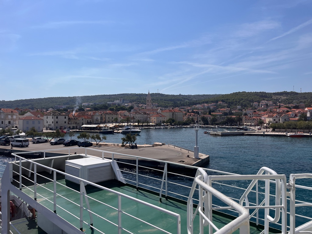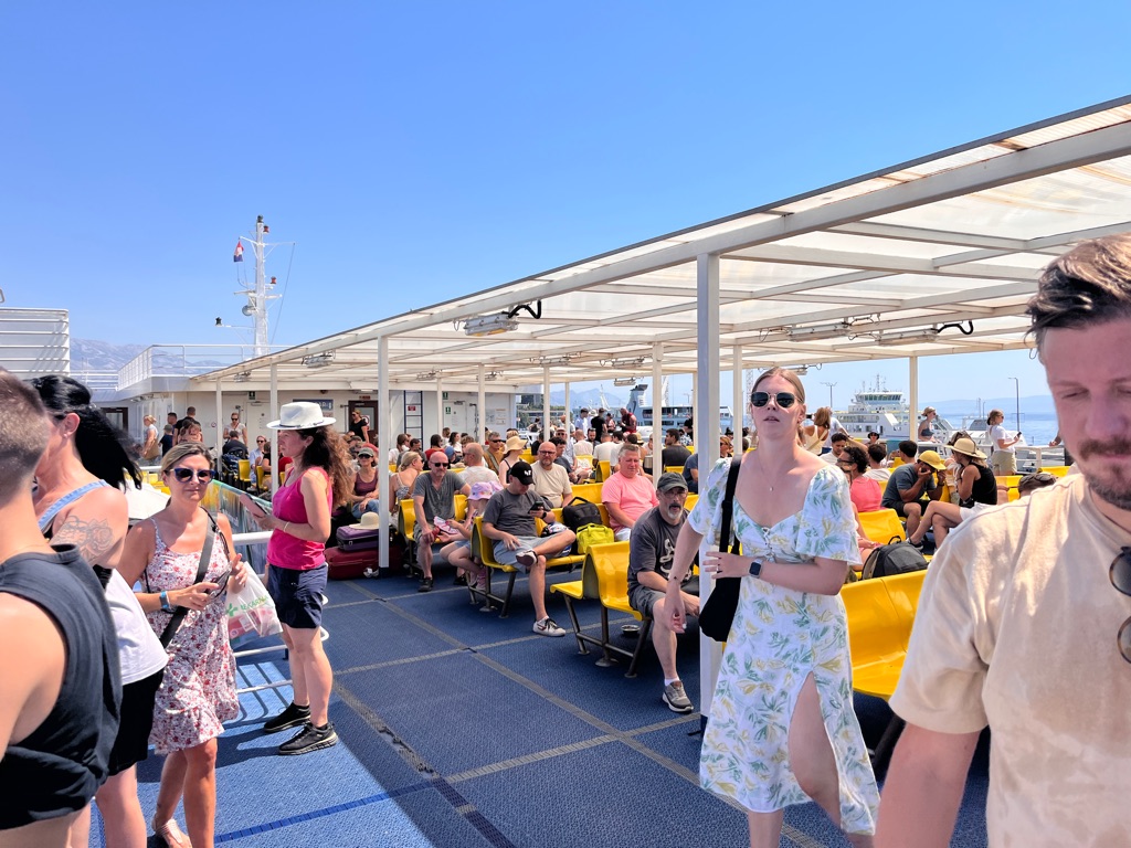Decided to board the waiting ferry right opposite the M & B office, thinking it was leaving at 11.45am. Very random boarding process as no queue and only person checking tickets was checking cars vs. foot traffic. Boarded easily (no escalator this time) and opted for a spot on the first deck, where it was quieter. Interior was packed with a bar/cafe offering bottles of vitamin water at €4.50. Surprisingly, ferry departed shortly after 11.15am. Perhaps they are adding additional sailings due to volume of cars (note to self: thanks for not renting a car in Split and then taking it to Brač).