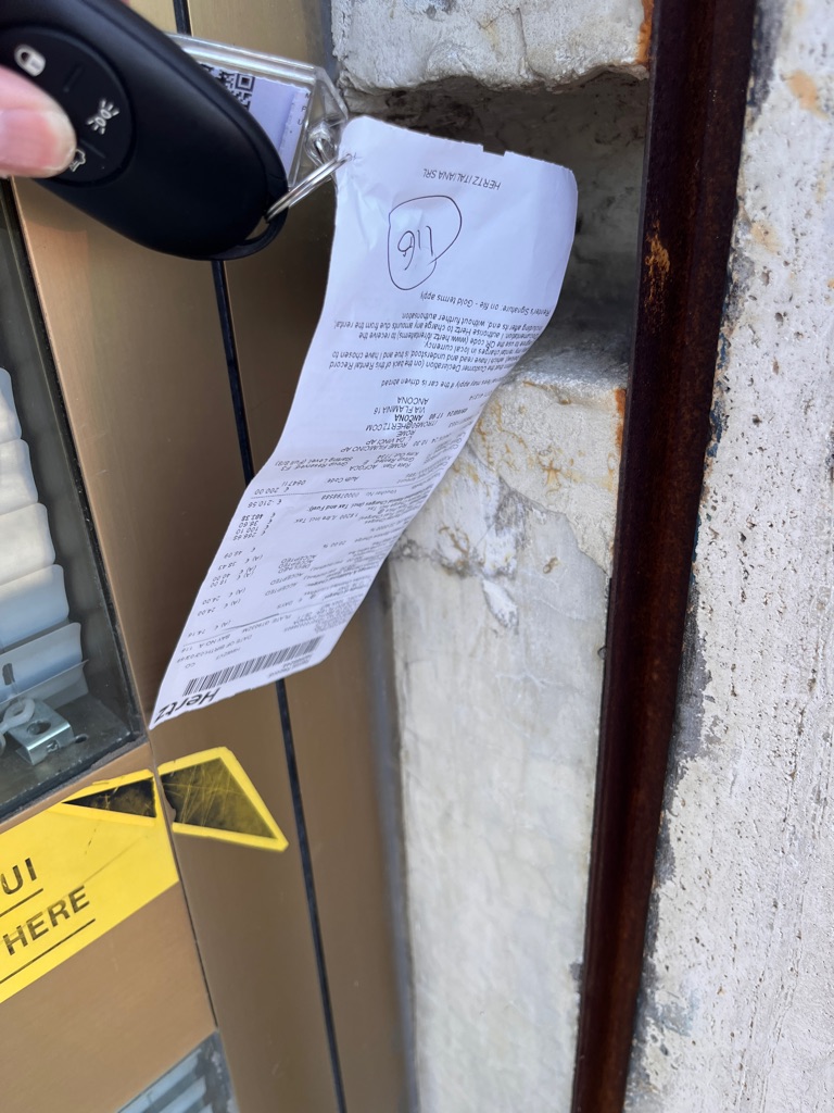 Sasha and I decided on a tour (south this time) to occupy some late afternoon time. Drove to Muccia and carried on going to small towns beyond. Took a bad turn, ended up getting stuck on a road being repaved, tried to squeeze past one of the construction trucks and managed to scrape the car on the barrier in the process. Definitely not go-faster stripes that can be disguised/hidden. Back to Castelraimondo wondering how Hertz would react and insurance implications. Not good.