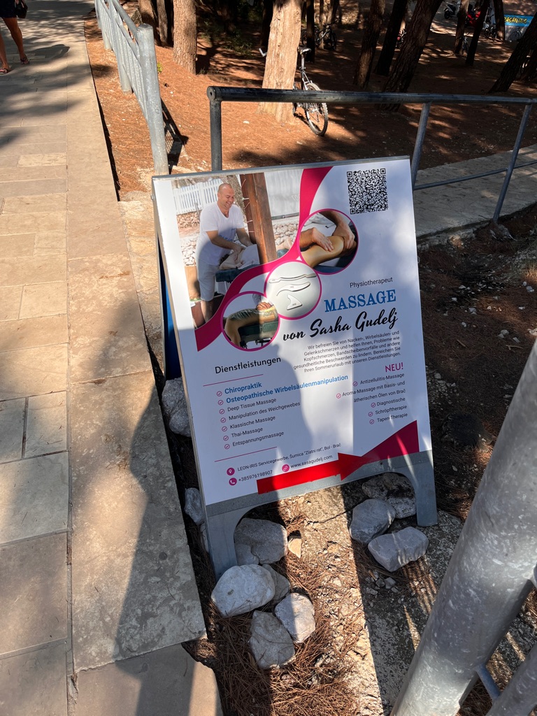Decided to make use of expensive hire car, so embarked on a mini ‘road trip’ around Brač, starting with a stop in Pučišća on the north coast, about 30 mins drive. Lots of hairpin bends with steep drops at the side of the road. Sasha not looking very impressed. Bought a limestone fridge magnet from one of the stalls close to our choice of place for some soft drinks at Caffe bar Škarpelin.