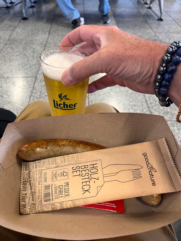 Got German sausage and beer as pre-flight snack while Sasha had a chocolate muffin.