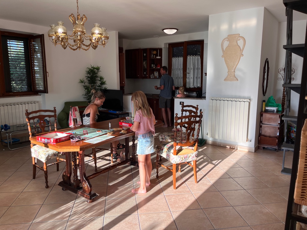 Started playing Monopoly before heading into Castelraimondo for dinner. Fish restaurant chosen by Phil looked crap so opted for much busier and lively Pizzeria Lanterna instead. With the kids this time so Jo departed on foot as Amber just being Amber. Back to Belvedere for more Monopoly until after midnight.