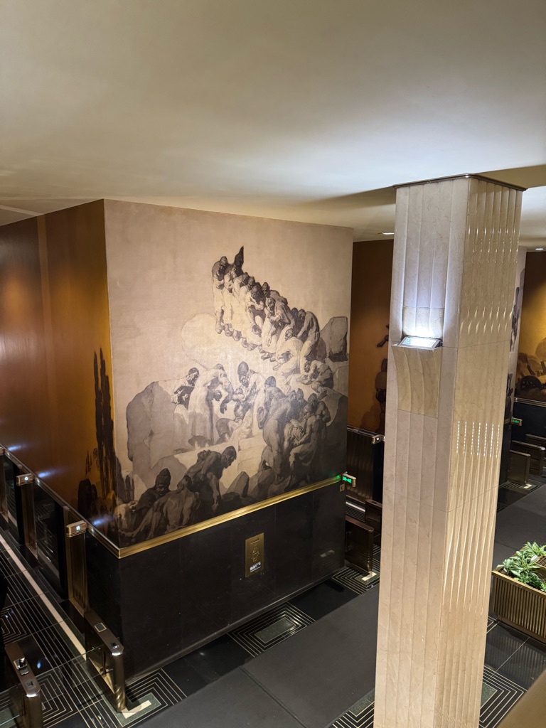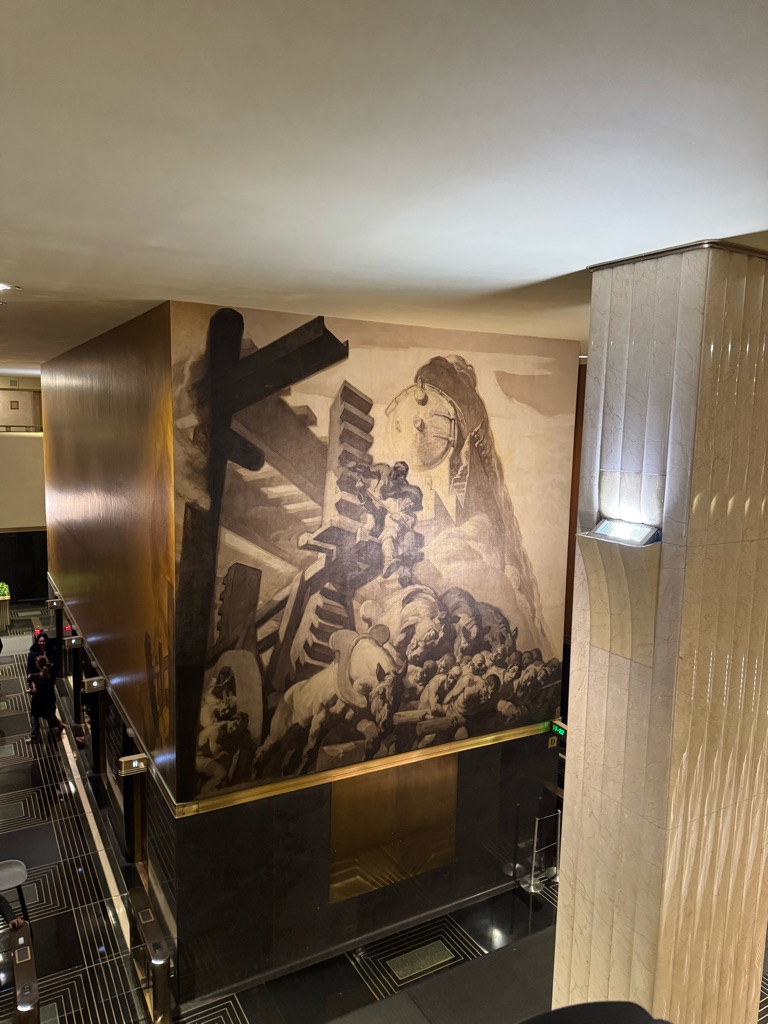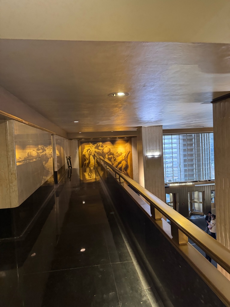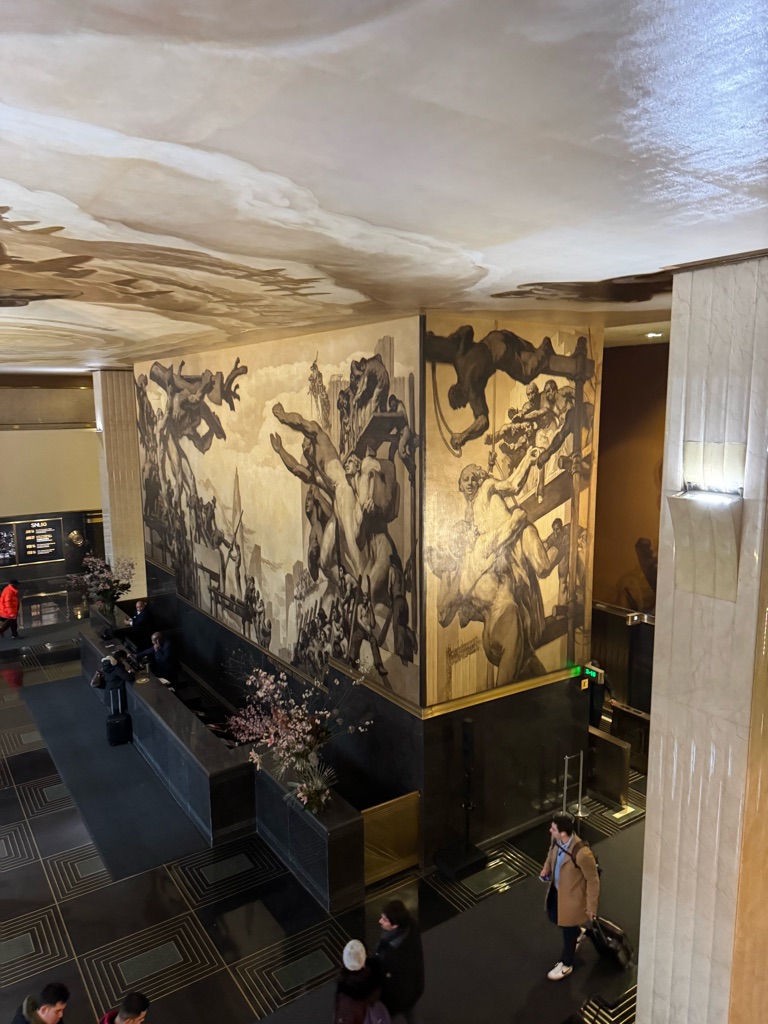 Our tour of Rockefeller Center was very cool! \240We learned about how John D Rockefeller Jr started construction during the Great Depression, giving jobs and hope to the whole city. Rockefeller Center was built as a city within a city, and a public art display. We learned the history of some of the art - the original mural at the entrance featured Vladimir Lenin because the artist was a Communist? So Rockefeller had the whole wall rebuilt and the new painting - American Progress - put up in its place. The original artist redid the painting in Mexico and added Jr to the painting, surrounded by drinking and smoking and gambling and all his least favorite things. Talk about throwing shade!