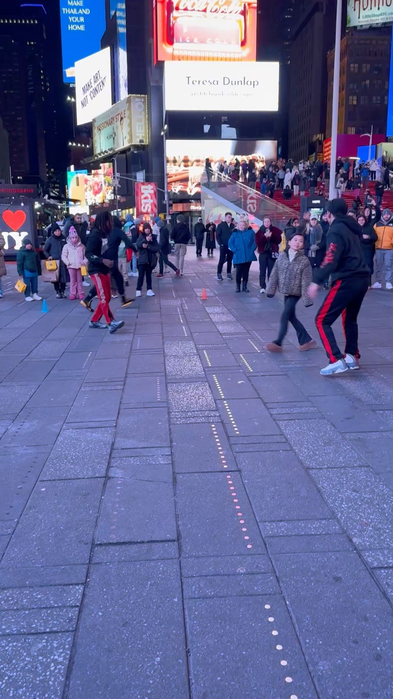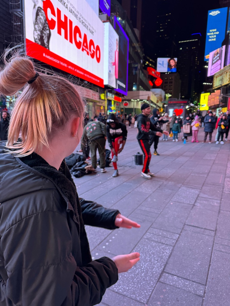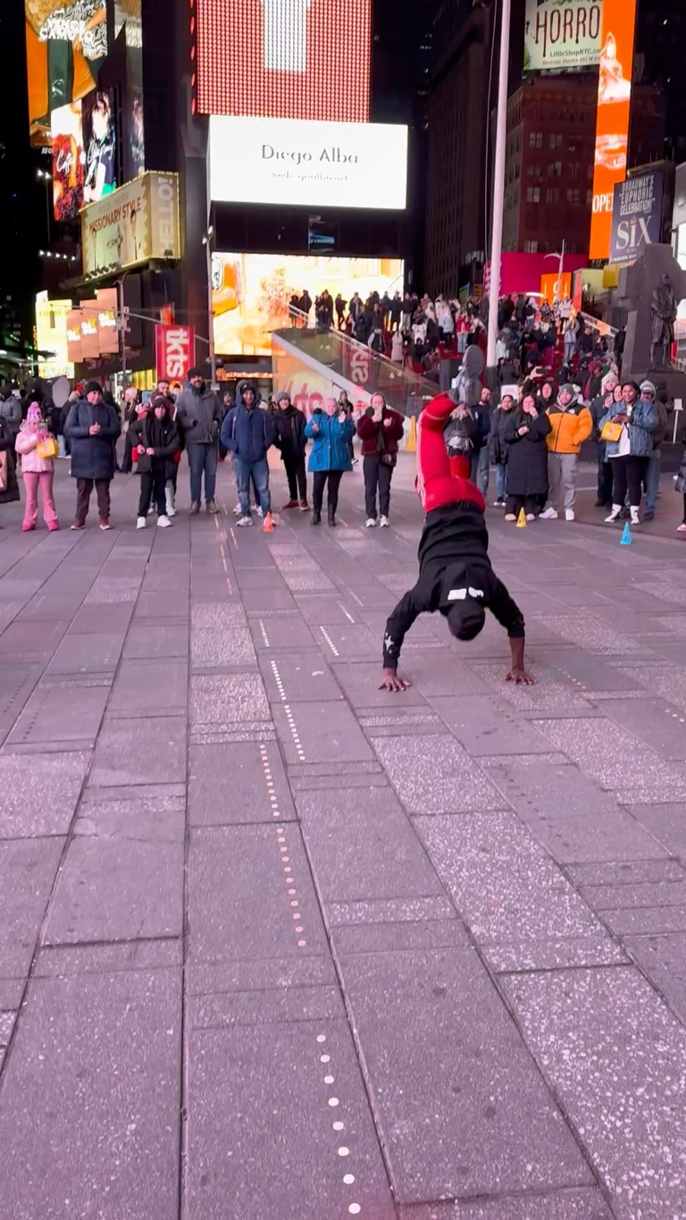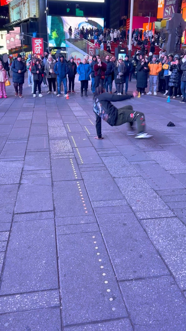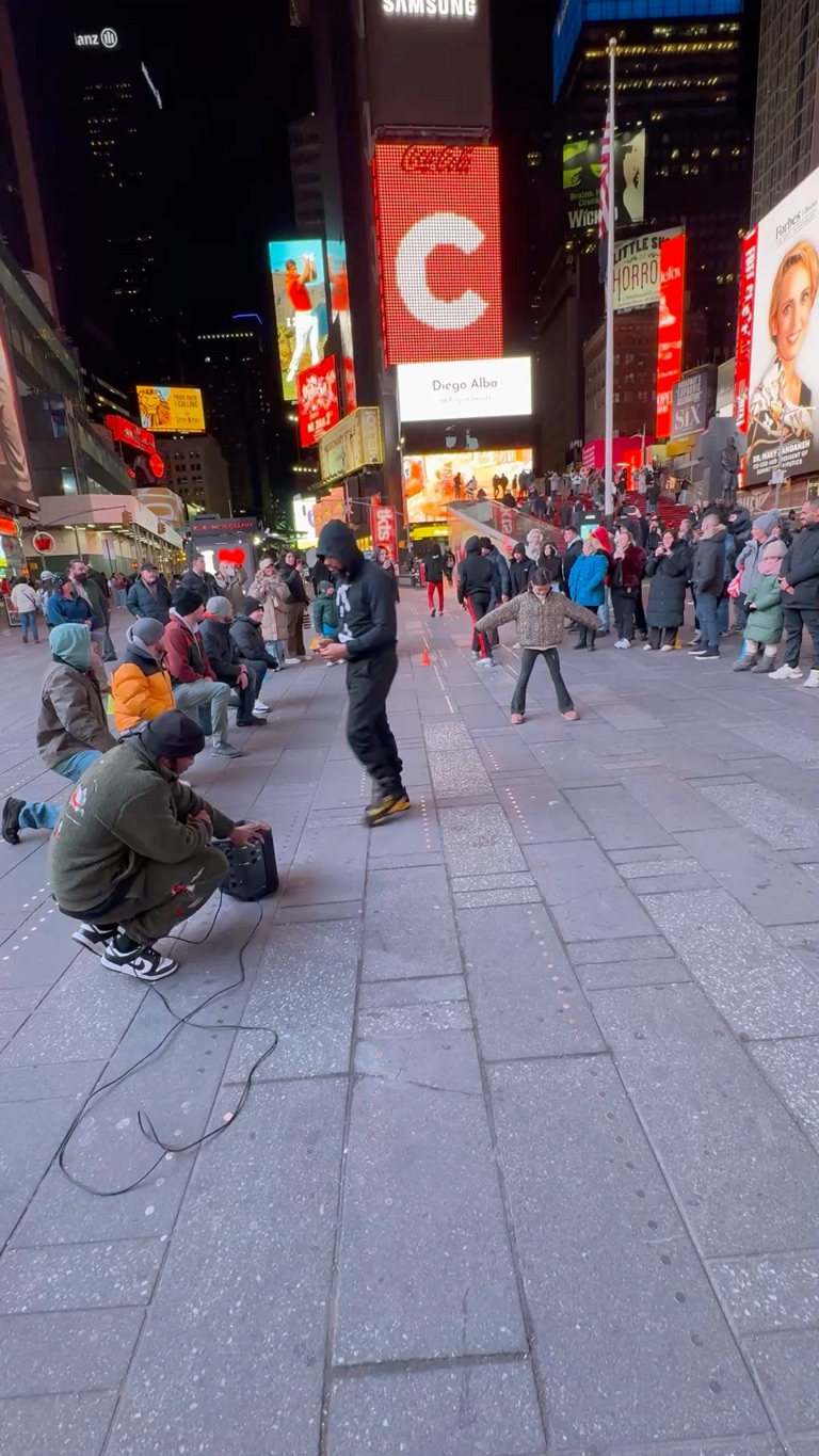 Kate noticed a crowd forming, so we walked over to see the “dance battle” that was starting. The breakdancing was great! Then they started jumping and flipping over the top of a kid and then some other people from the audience! Kate: “How lucky are we that this happened to be going on right when we got here?!” \240I told her there’s always something happening in Times Square, and we started walking south. About a half a block down… and there was another breakdancing group!