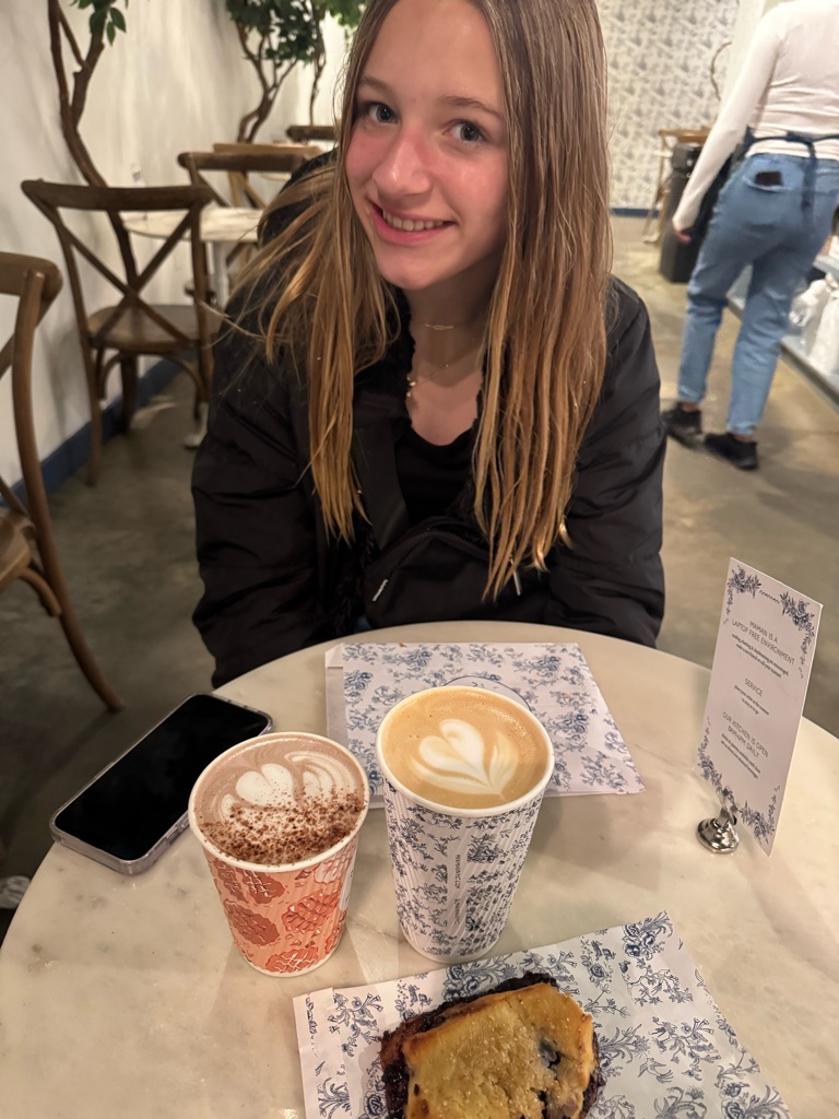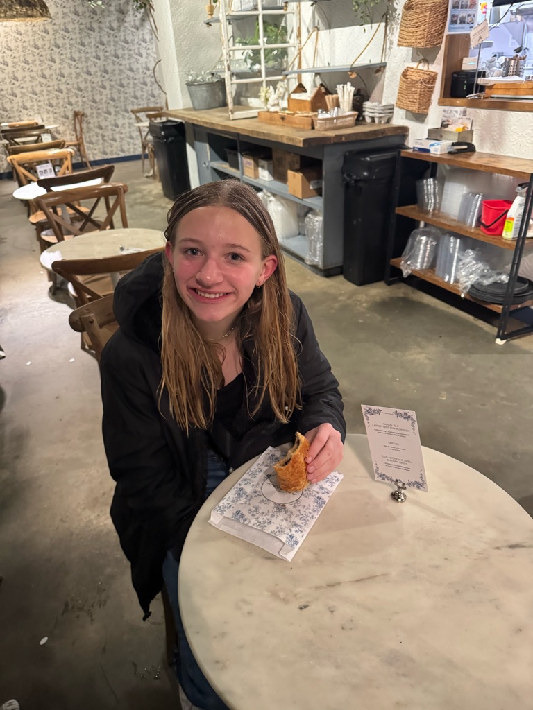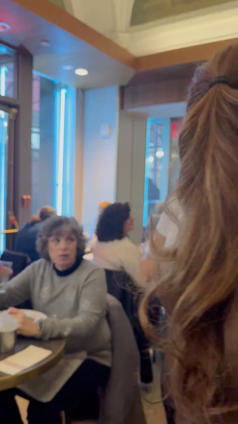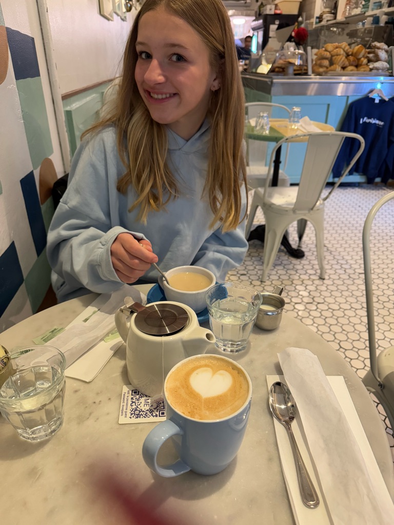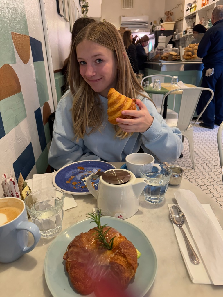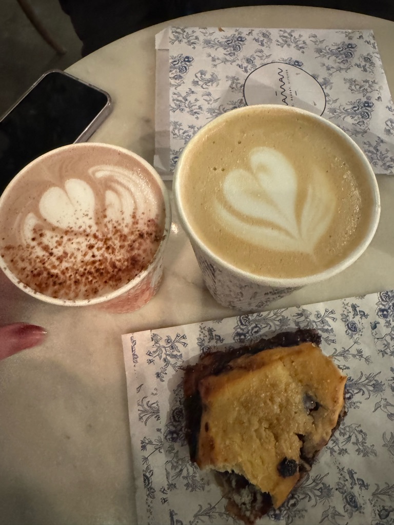This morning started slushy and slippery - Kate themed it “Fresh Air and Frozen Hair.” \240We headed to breakfast at maman. Unfortunately the kitchen didn’t open til 8, but we loved our pastries and hot drinks! Pain au chocolat and hot chocolate for her, blueberry goat cheese scone and vanilla latte for me.