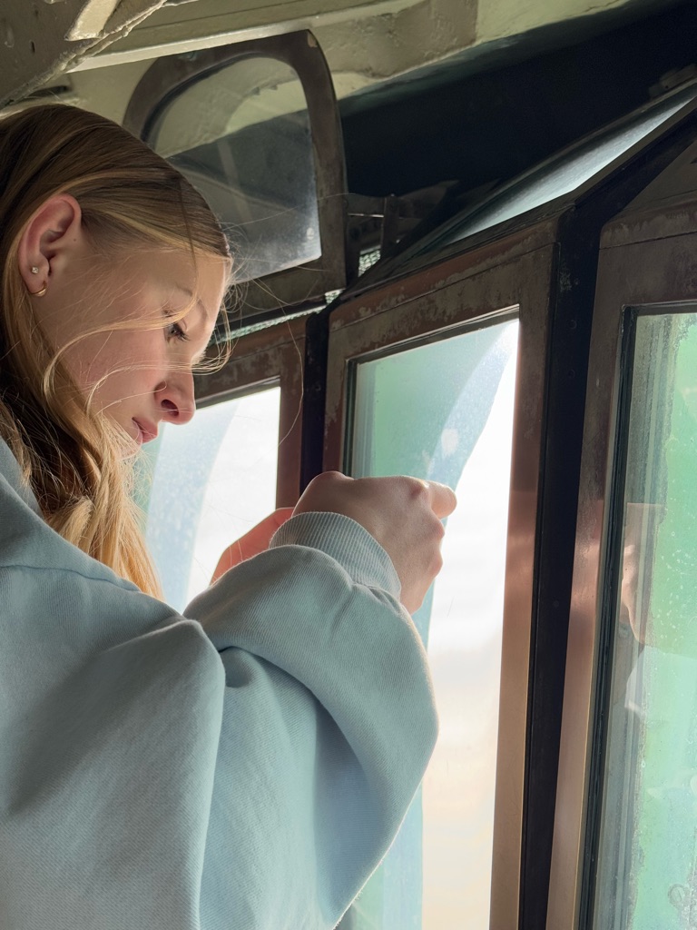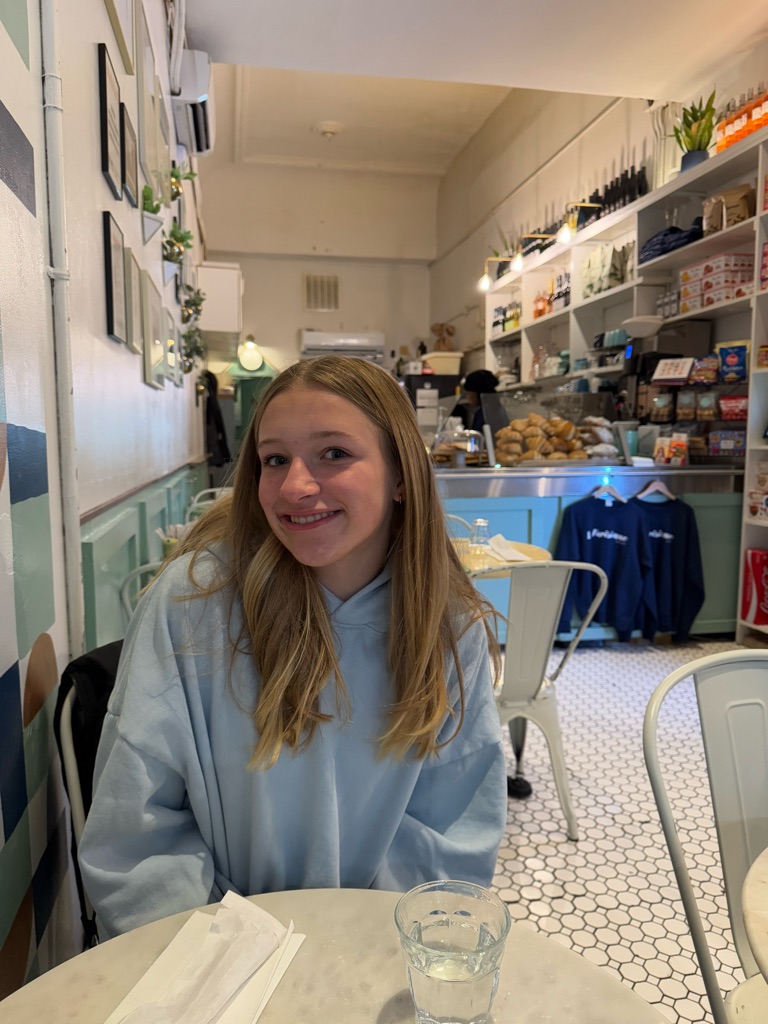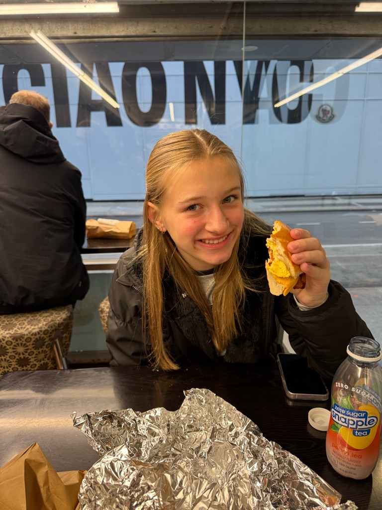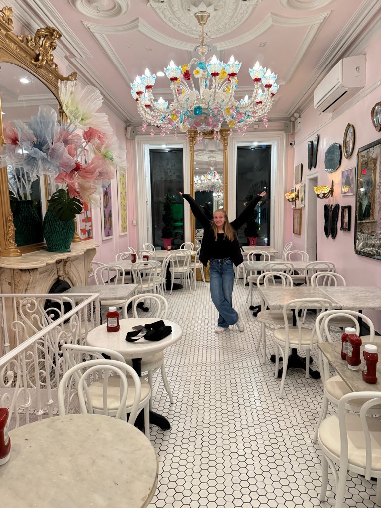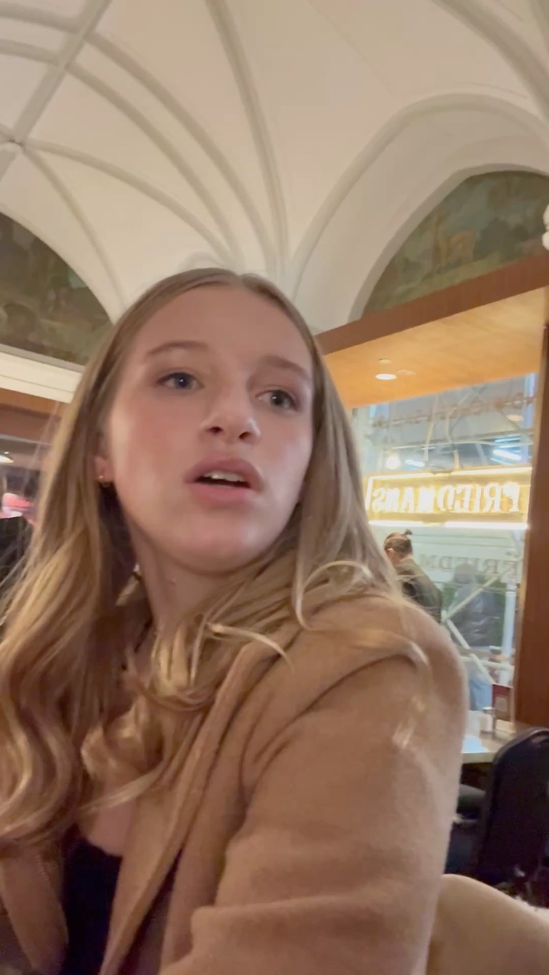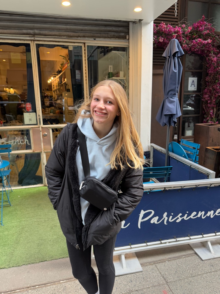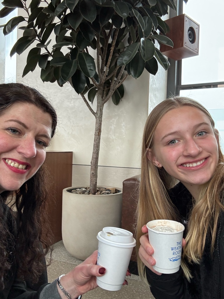 This morning started slushy and slippery - Kate themed it “Fresh Air and Frozen Hair.” \240We headed to breakfast at maman. Unfortunately the kitchen didn’t open til 8, but we loved our pastries and hot drinks! Pain au chocolat and hot chocolate for her, blueberry goat cheese scone and vanilla latte for me.