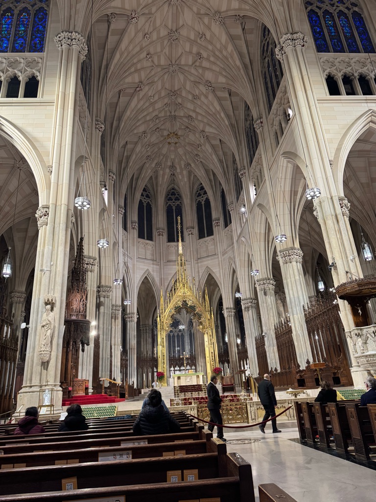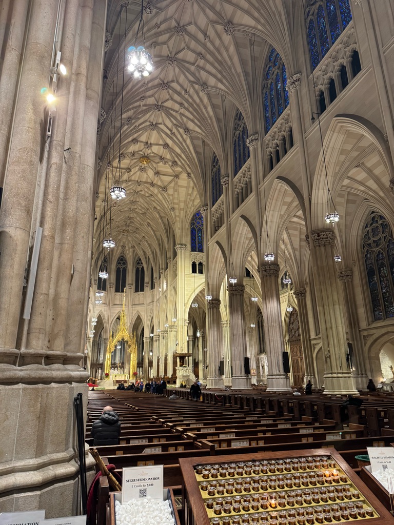 Next we headed over to St. Patrick’s. On the way, we saw them taping Fox & Friends!. As we rounded the corner, the spectacular Cathedral came into view. Kate deemed it beautiful. \240We went in and the 7:30 mass was still going so we walked around a little and got a couple of souvenirs. Then we joined mass at 8am. That was a very cool experience. Though you could tell we were the out of towners - we were the only two people who took our coats off.