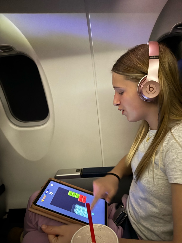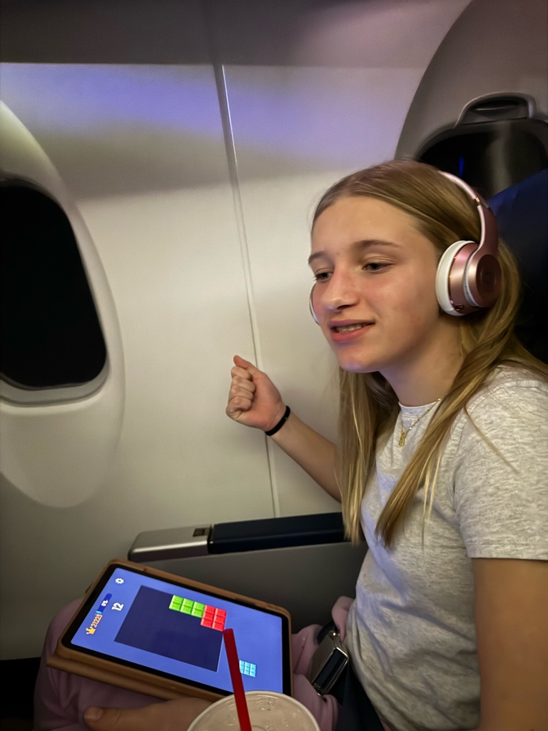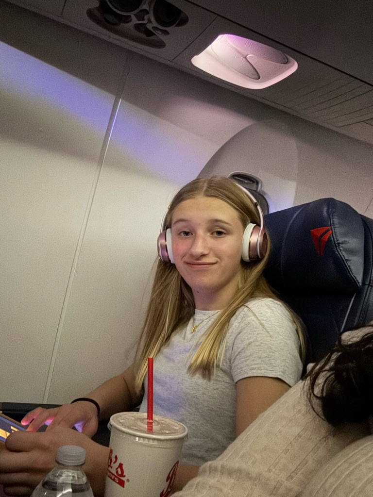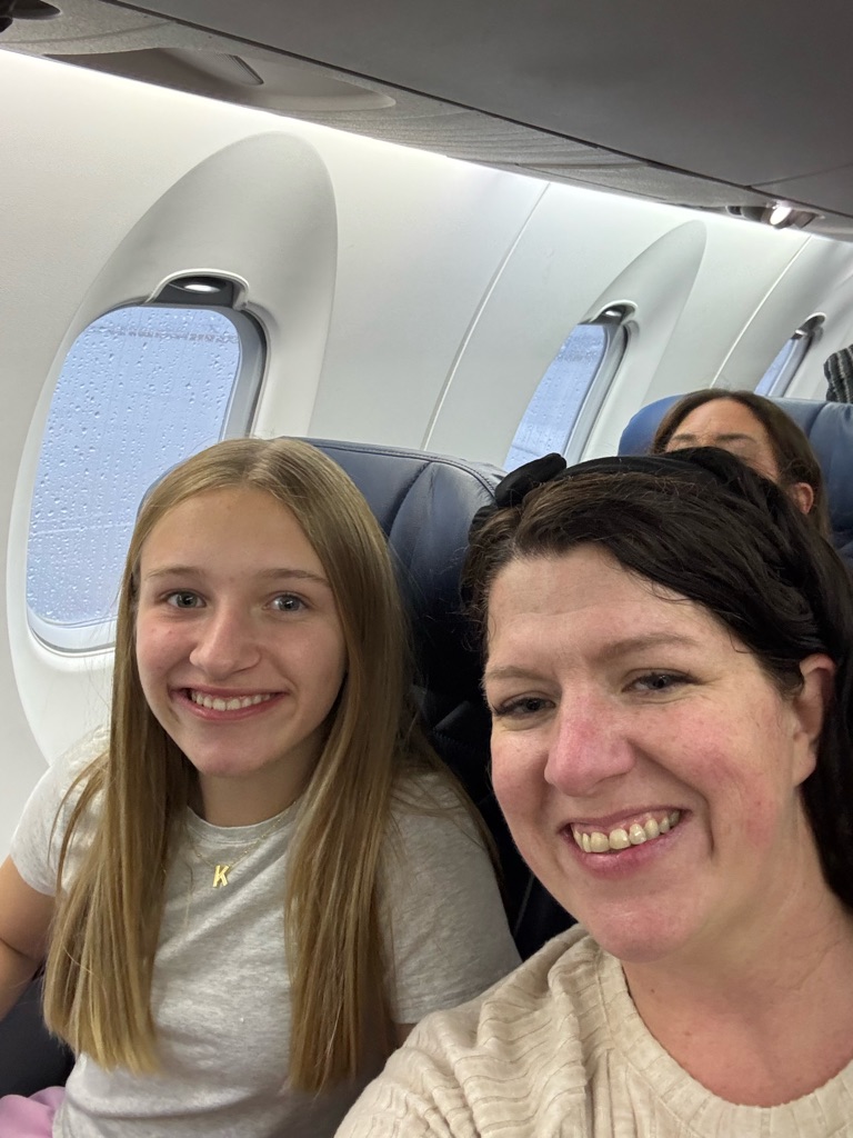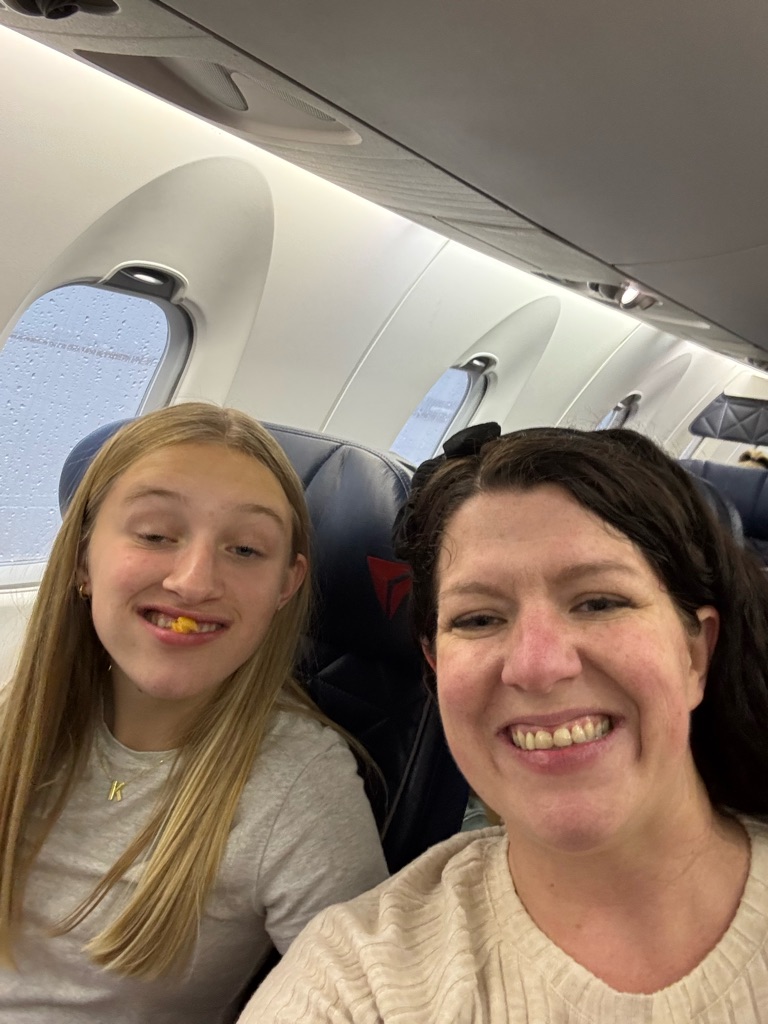 We’re on a smaller plane so first class isn’t much different, but still more room! \240Kate likes the vibe of the small plane much better. Now just waiting for them to de-ice the plane and we’ll be on our way!