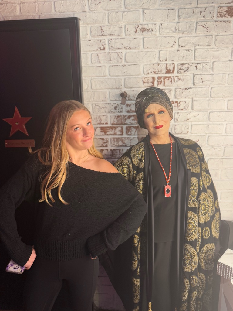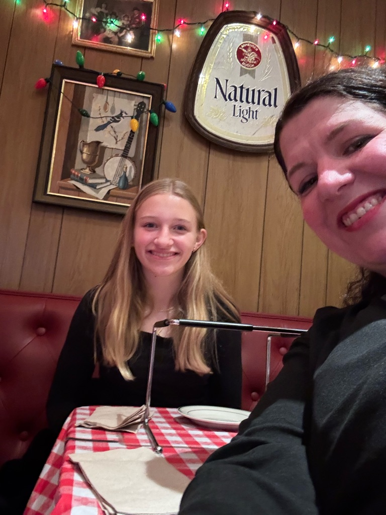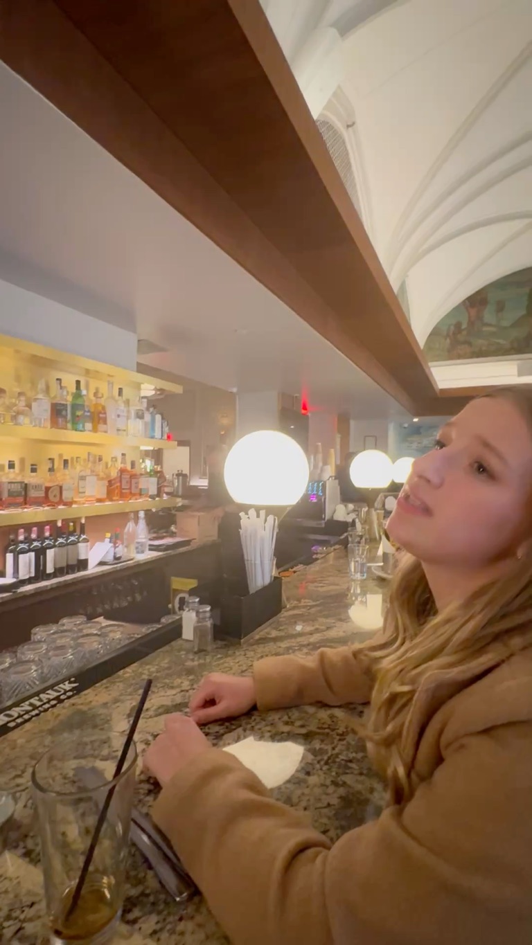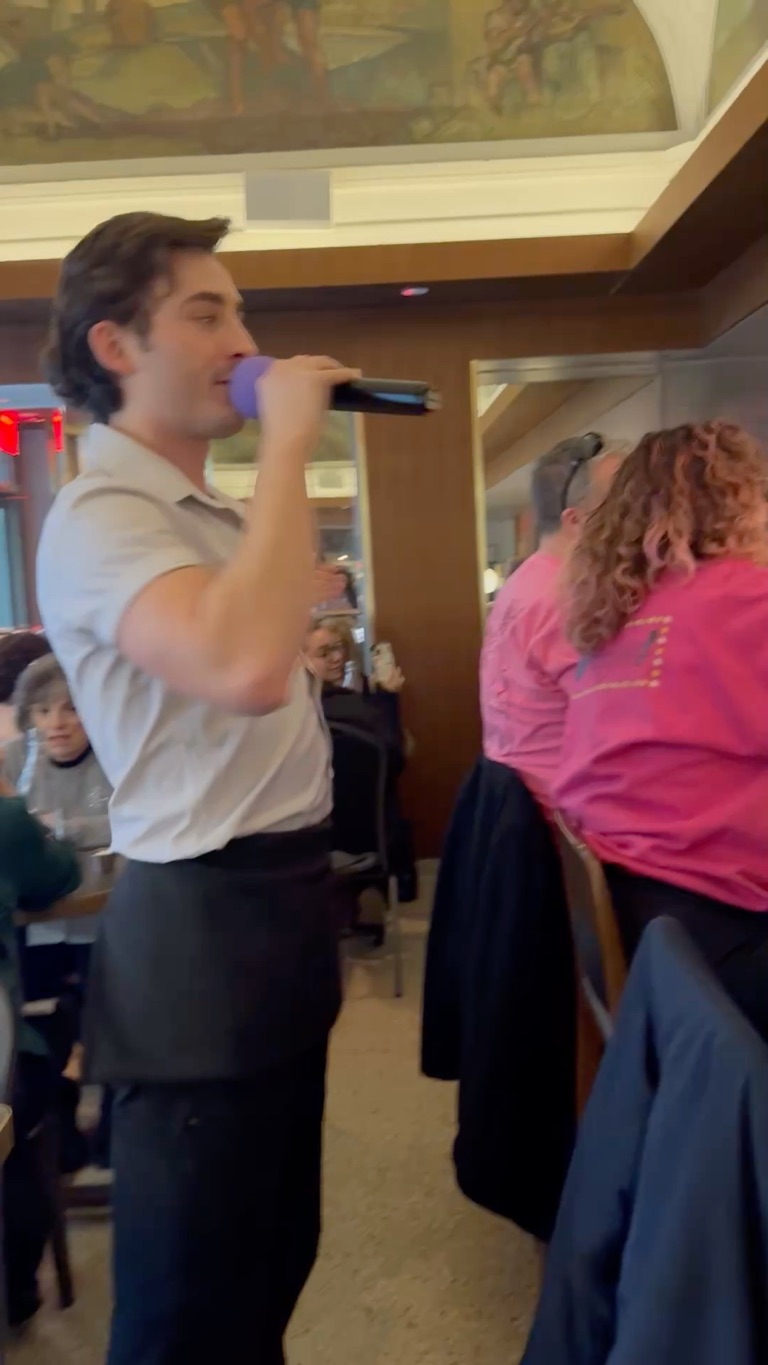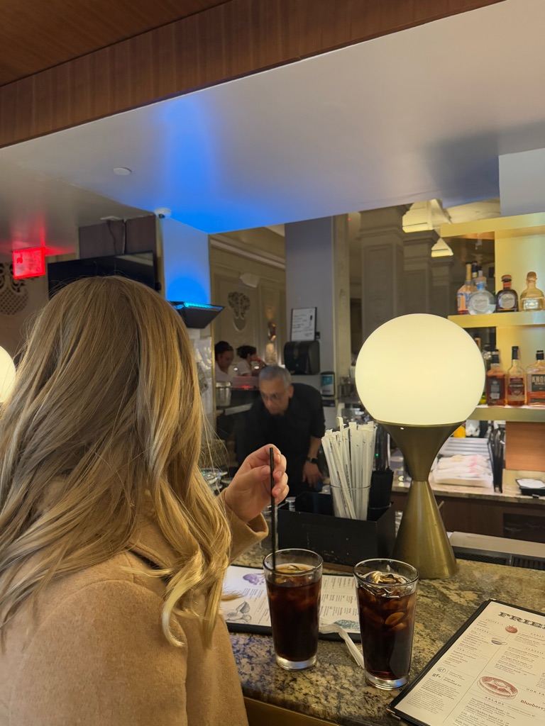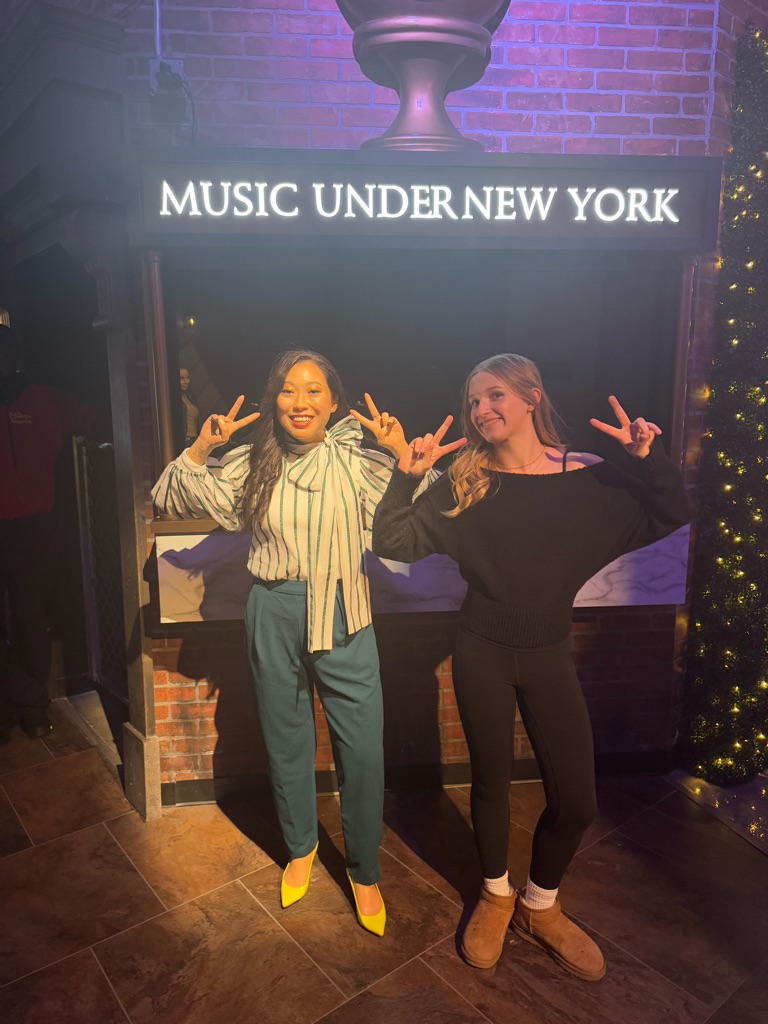 We got ready and headed to an amazing restaurant where… I messed up and made reservations for tomorrow night instead. All of the servers at the restaurant are Broadway hopefuls and they sing and perform throughout the meal! \240Undeterred from checking it out, we hung around awhile and eventually snagged a standing spot at the first come first served bar. As soon as our food arrived, a gentleman got up and offered Kate his seat, which was so kind. As we were there, so many performers came right up to Kate! \240She told me God had a plan to make the night even better - if we’d have had that table we wouldn’t have been nearly as close to the performers. It worked out perfectly. As she said - serendipity.