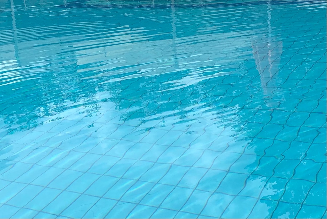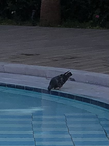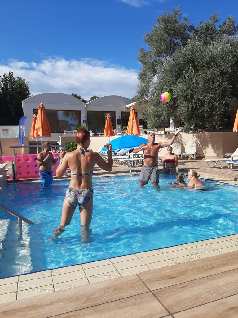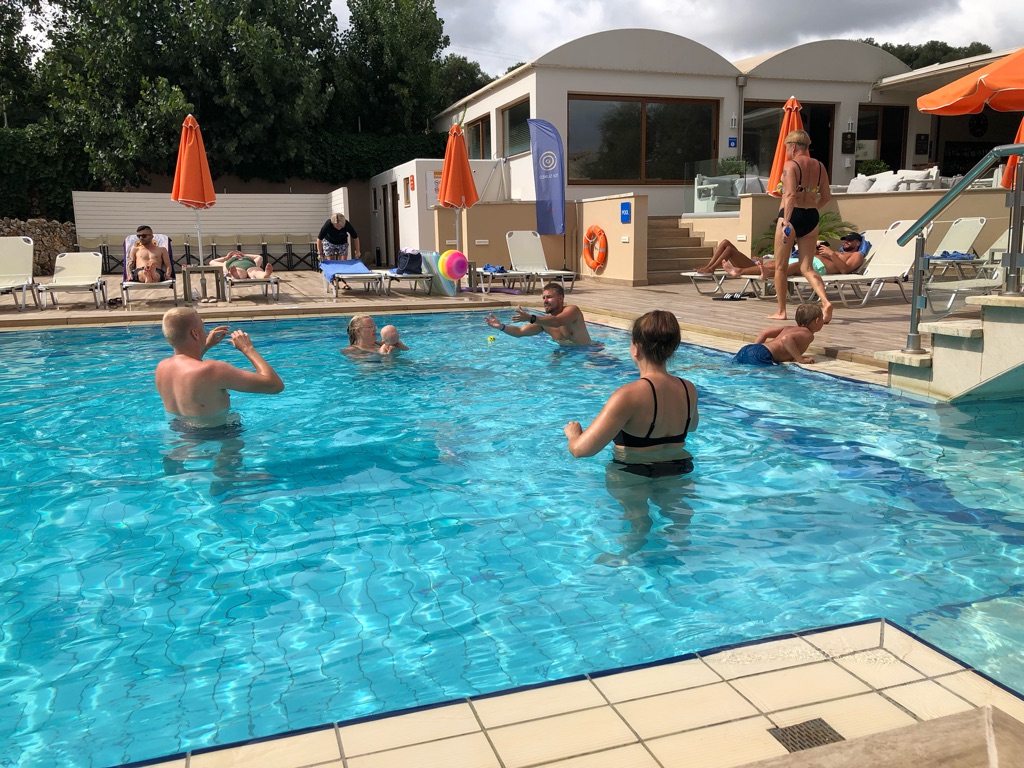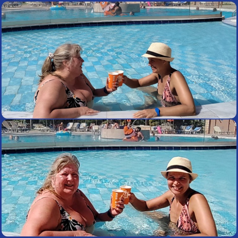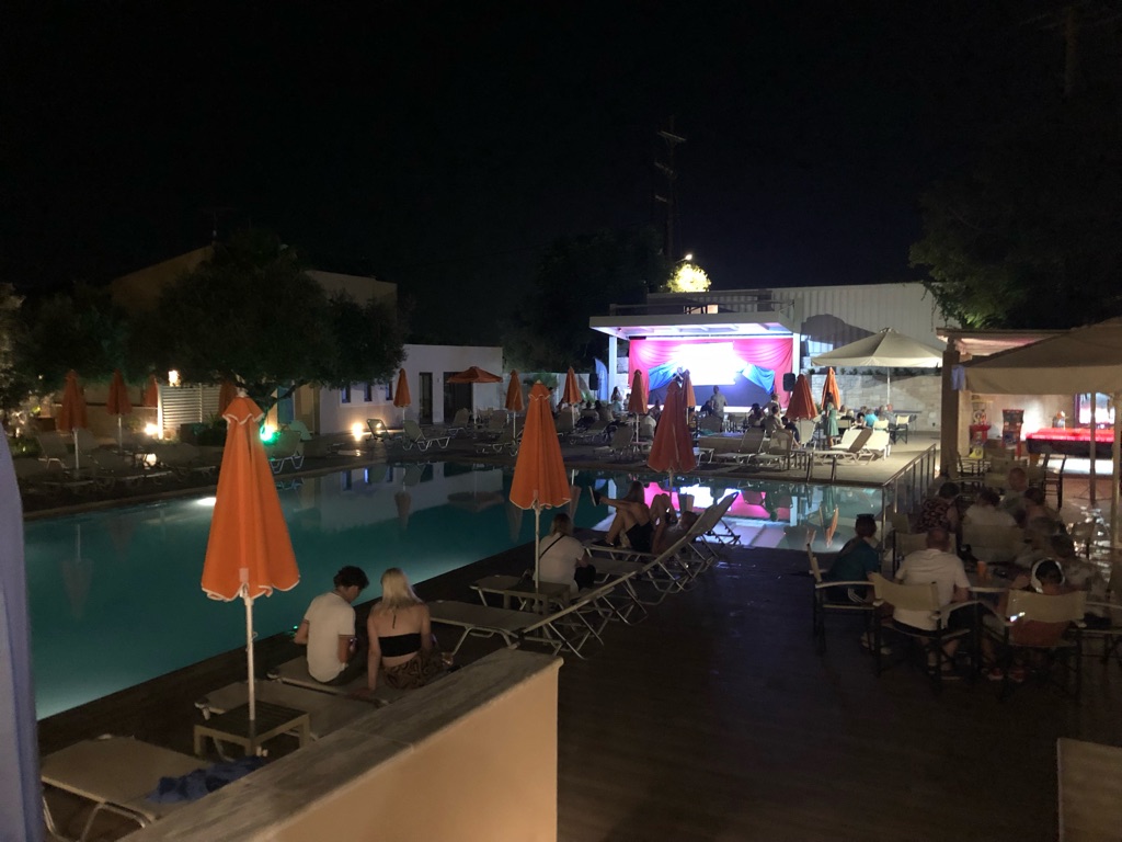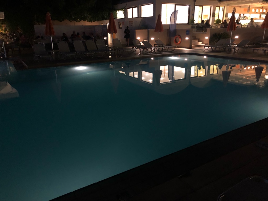 Alueella kolme allasaluetta. Tämä on ihan ikkunan alla ja ympärillä ravintolat, baari, bilis ja illan esiintymislava.