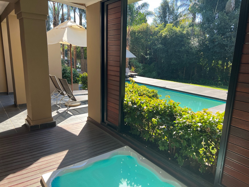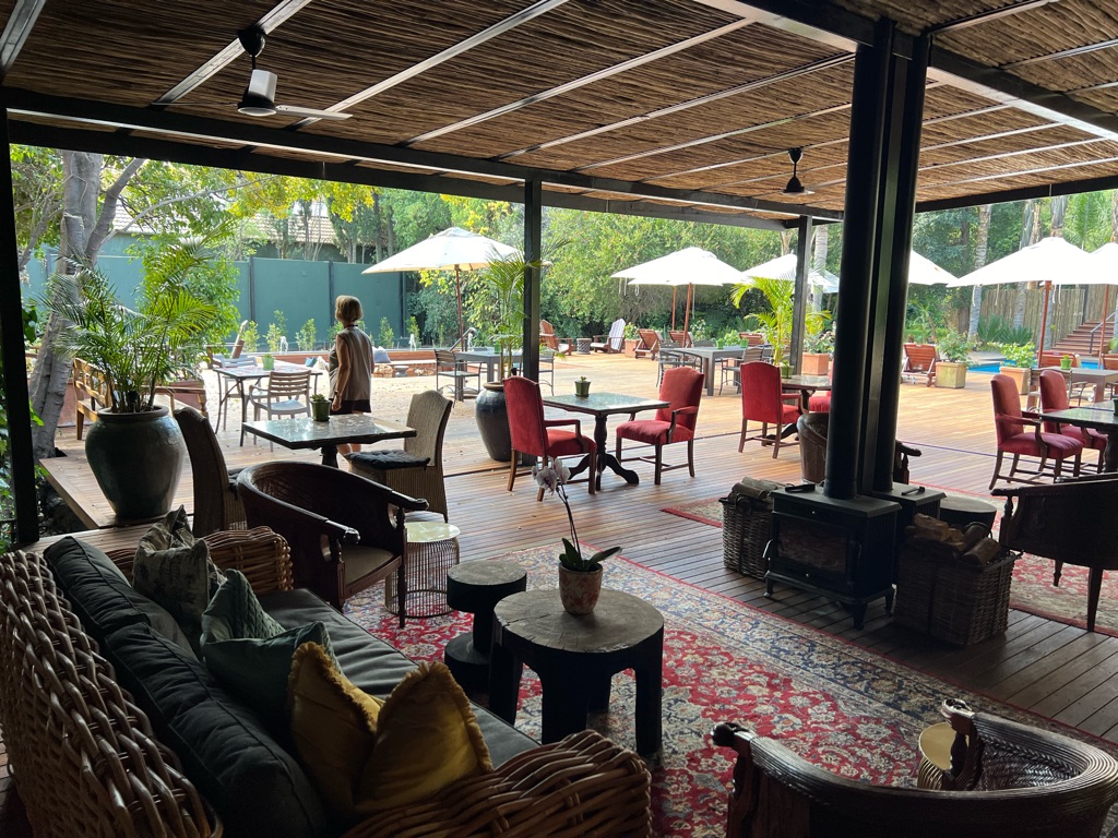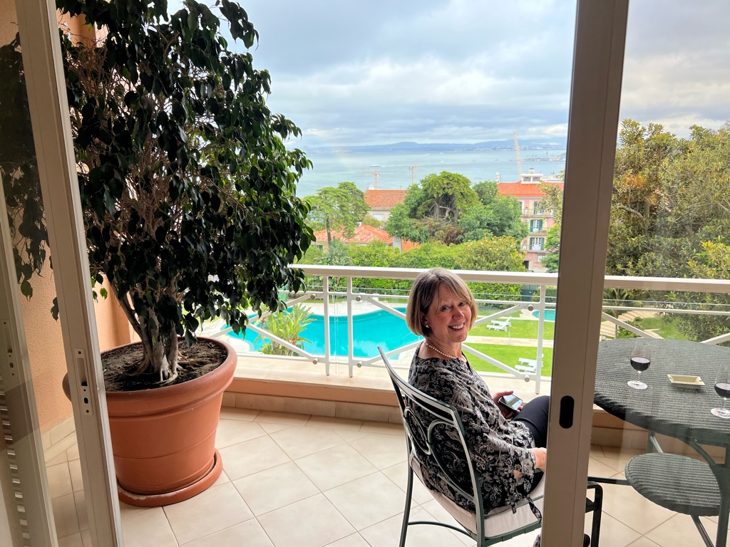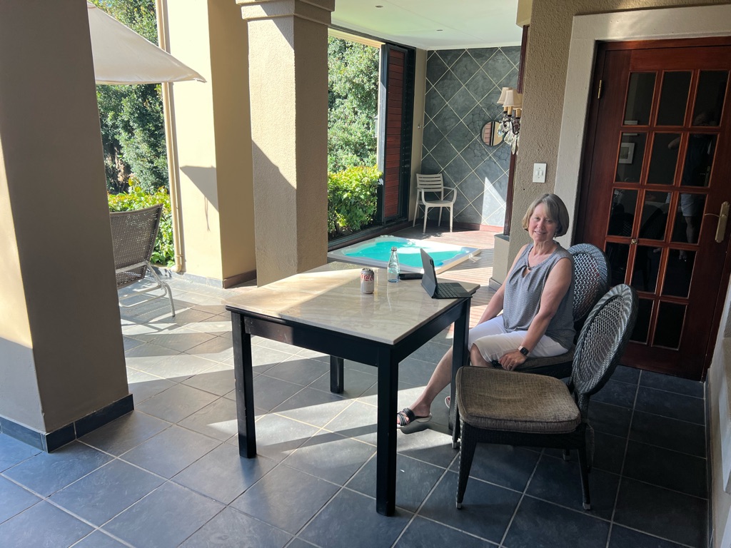 Beautiful patio in our room overlooking the pool and garden, and looking at the river. \240We had to break into the complimentary bottle of Port they left for us... 🤣