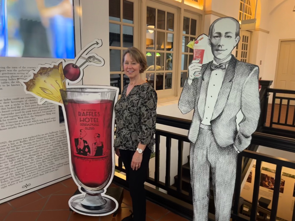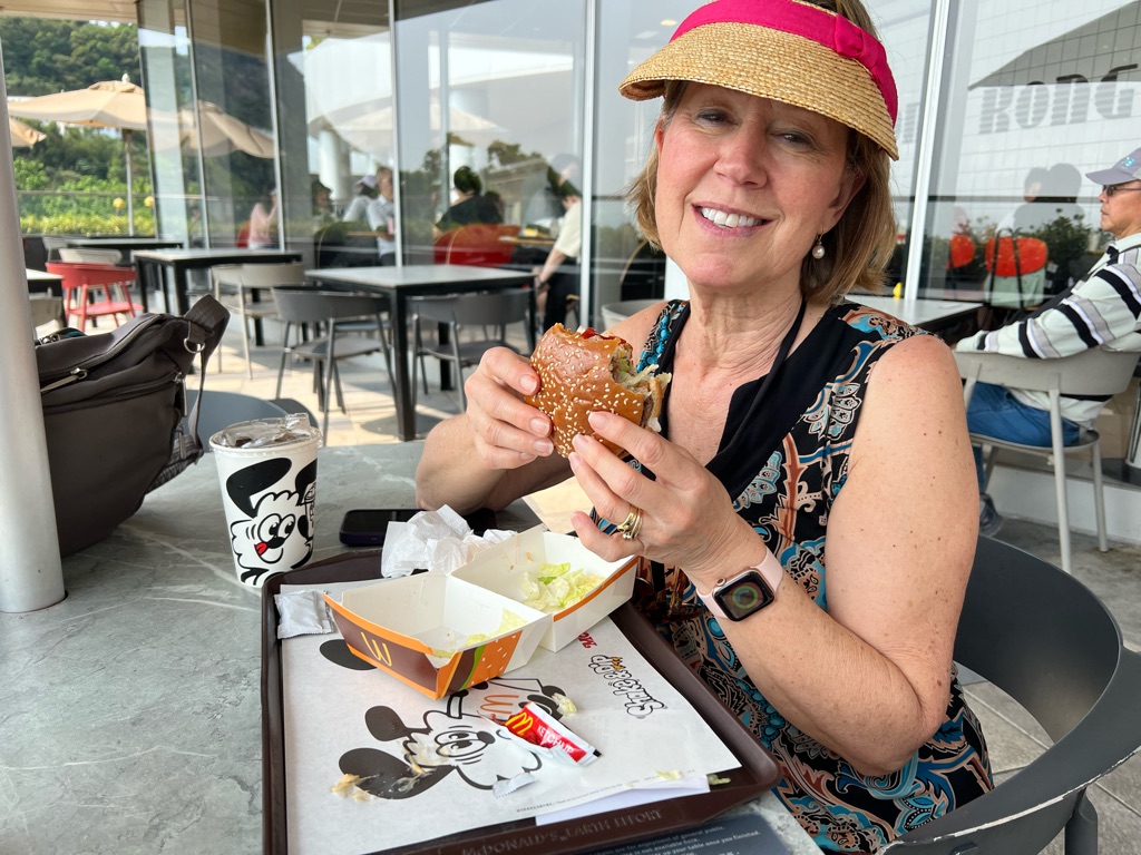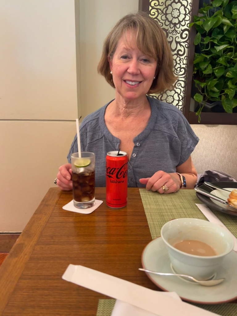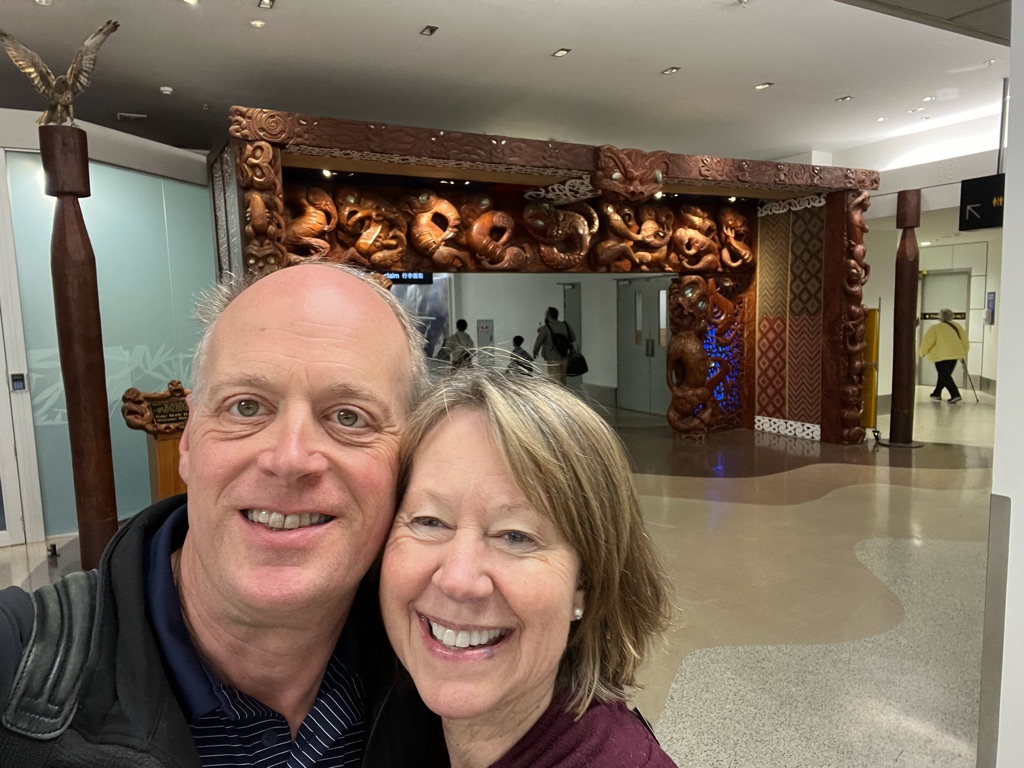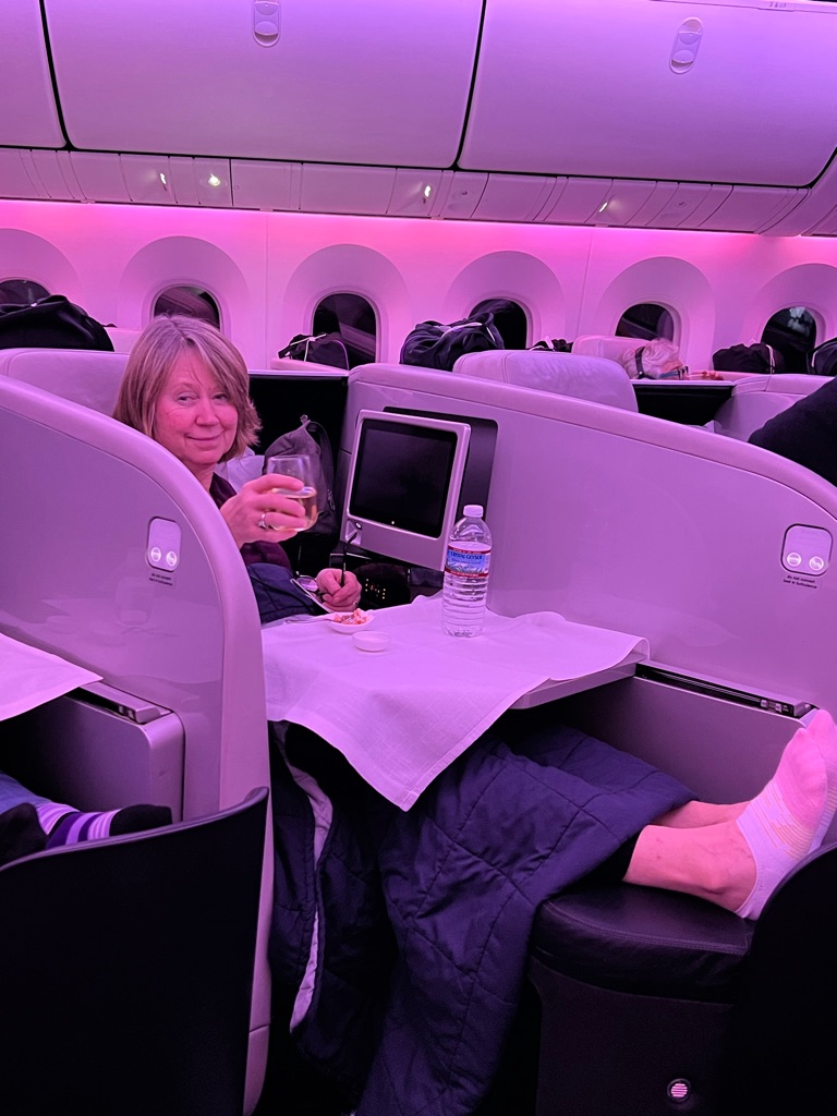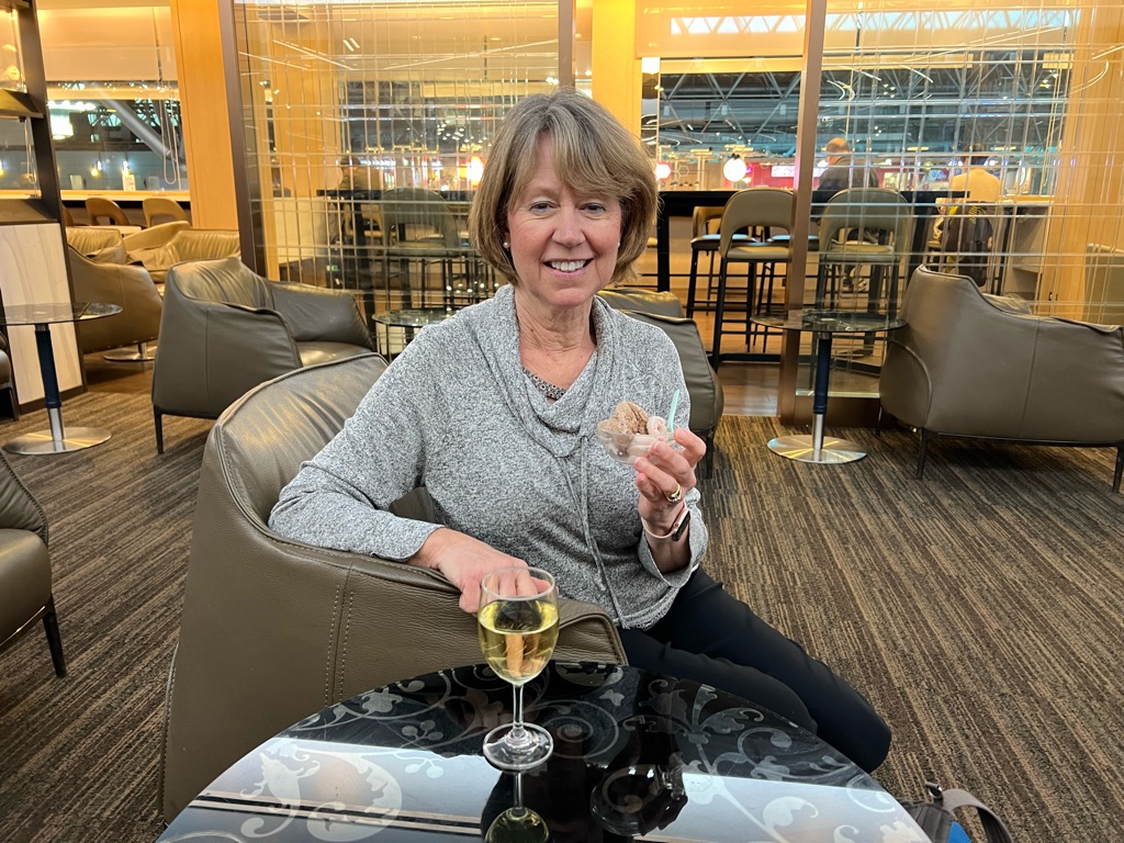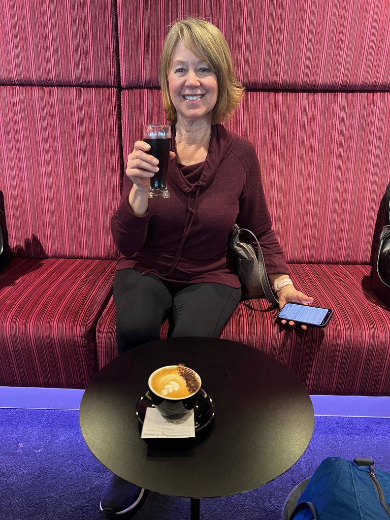 Waiting in the Air New Zealand lounge. Kim’s happy with her Diet Coke!