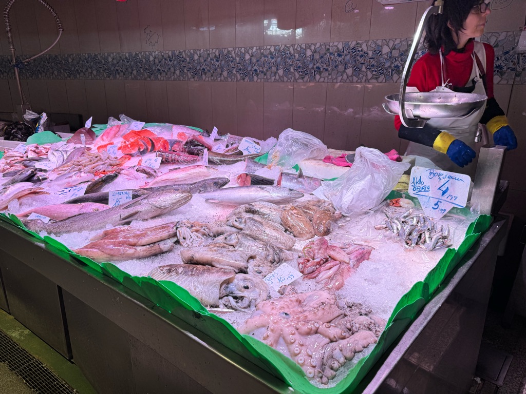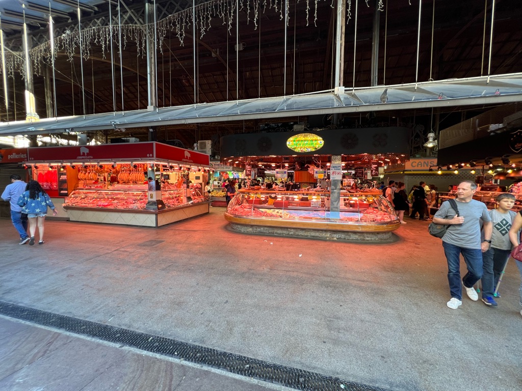 After a short nap, we headed out for a walk. \240First stop, a nearby food market (Mercado de la Boqueria). \240Incredible selection of meats and fish!