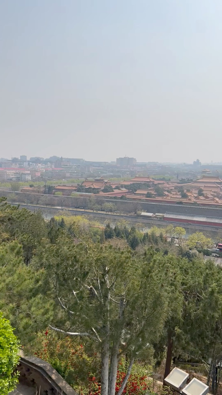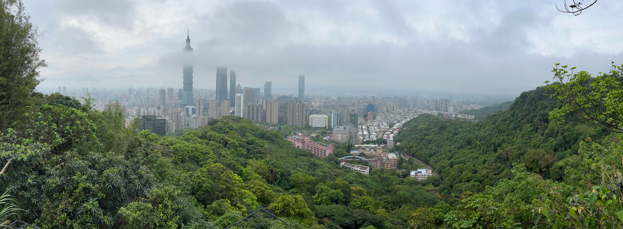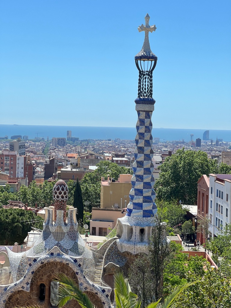 A view of the city from inside the park, with some of Gaudi’s structures in the foreground.