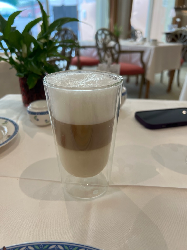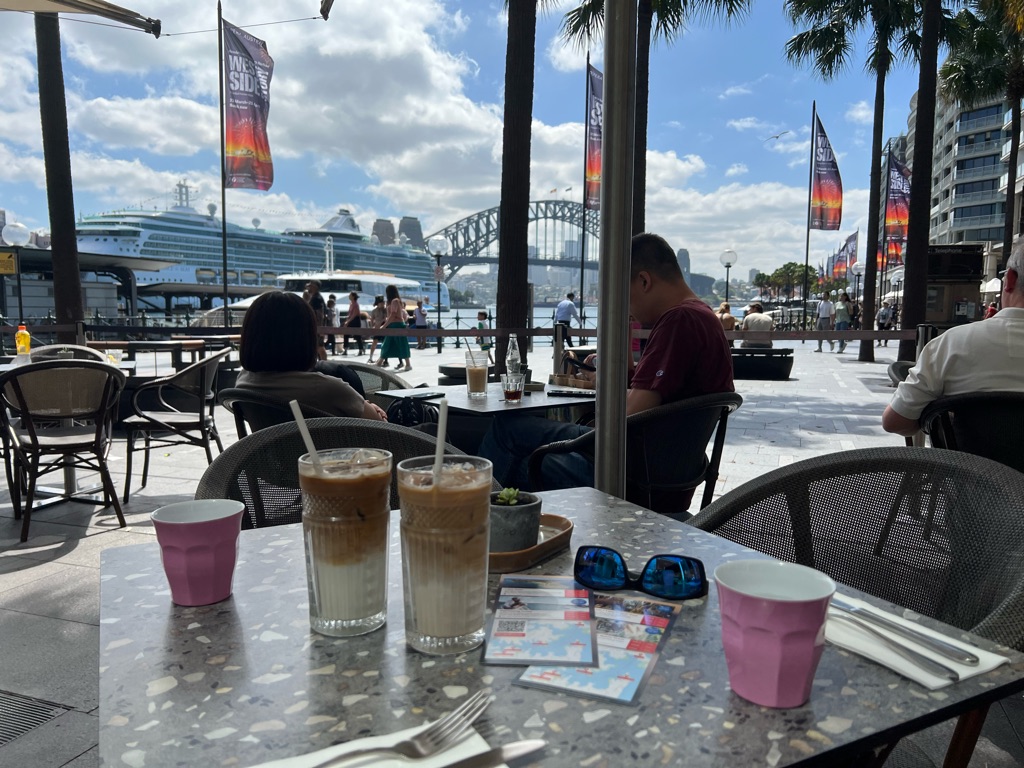 Had to stop in one of the many outdoor coffee shops for an iced flat white and lunch. \240There was a Royal Caribbean cruise ship (Brilliance of the Seas) pulled into port.