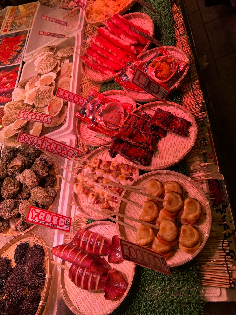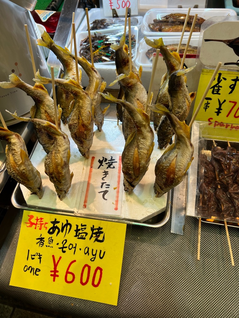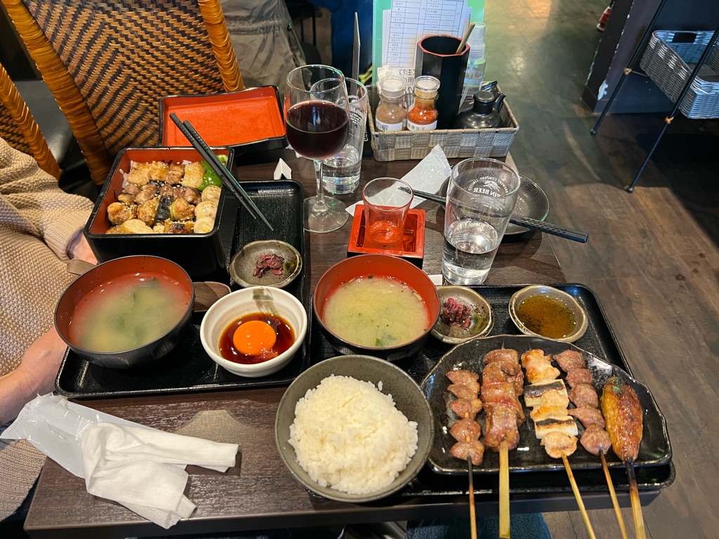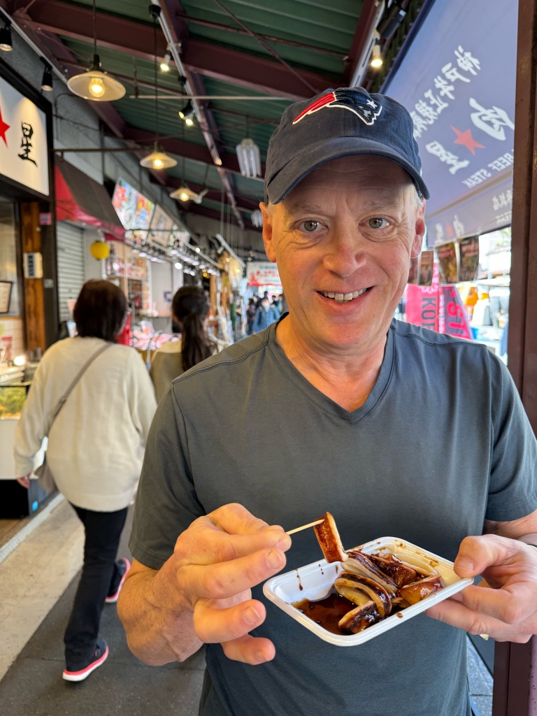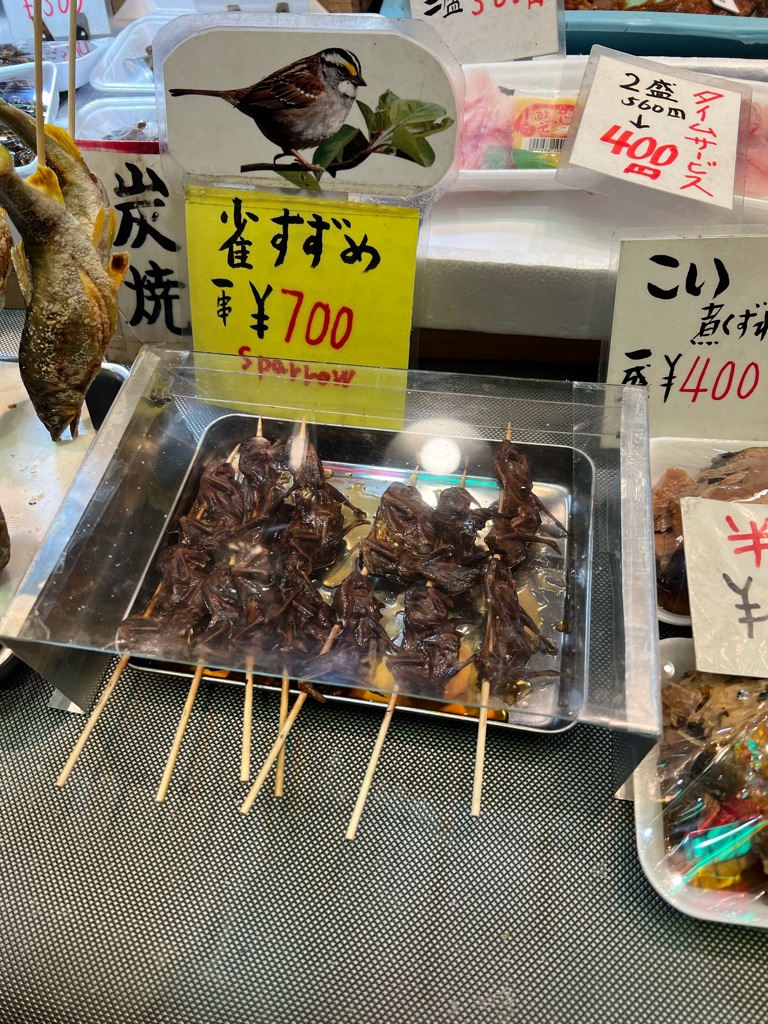 Saturday wound up being our day of rest… We really didn’t do much. \240The hotel was not ready for us to check in when we arrived, but the train station had a GIANT food area with probably 40 different little restaurants. \240We picked one that seemed like it had some good transition (to Asian) food, like chicken. \240But they eat all parts of the chicken. \240You could choose between heart, gizzard, tail, thigh, and “lever”. \240Didn’t really want any of those, and had no idea what part of the chicken “lever” came from, so we’d skip that too. \240Figured we’d keep it simple and just get the 5 skewers of what we though would be tenders. \240Well it turned out rather to be an assortment of all 5 parts of the chicken. \240Who knew “lever” is liver?!? \240Kim couldn’t eat the tail parts (too chewy / fatty), and the gizzards were pretty tough. \240But Marc powered throuugh all of it… 😂