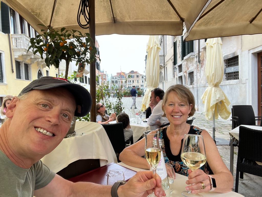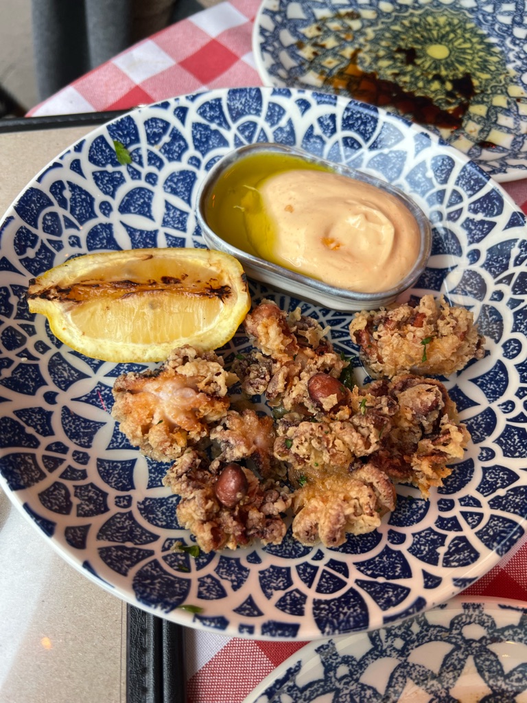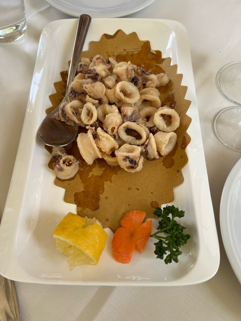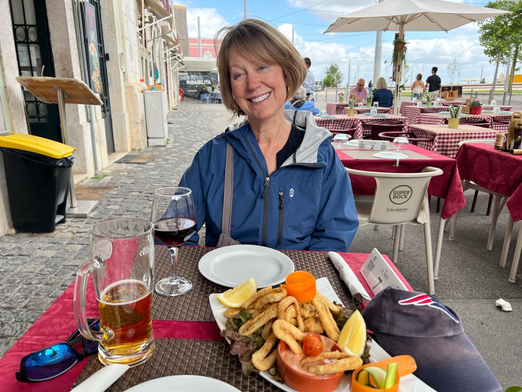 The walk didn’t last all that long before we decided it was time to take a break and get some beer and wine. \240Marc had a craving for fried calamari (one last time). \240We stopped in several places asking if they had calamari, which they didn’t. \240Finally one place said, “not on the menu, but we can make it…” \240It was excellent!