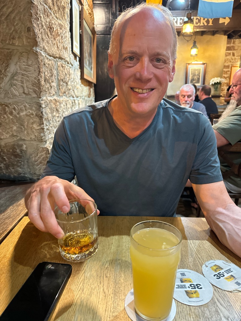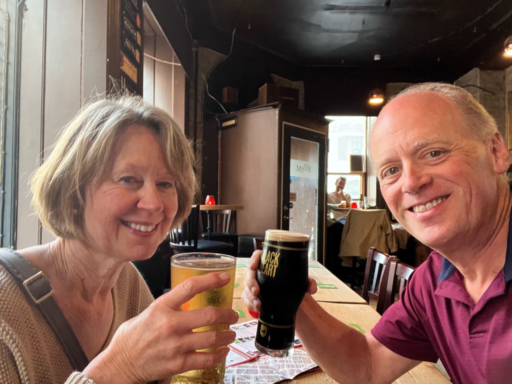 Went down to Lord Nelson’s for a drink and dinner. \240Tuesday was “Curry Night”. \240Great selection of beers, but not surprisingly, Kim got a (sweet) cider and Marc got a bourbon (Knob Creek 😄).