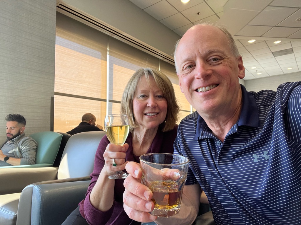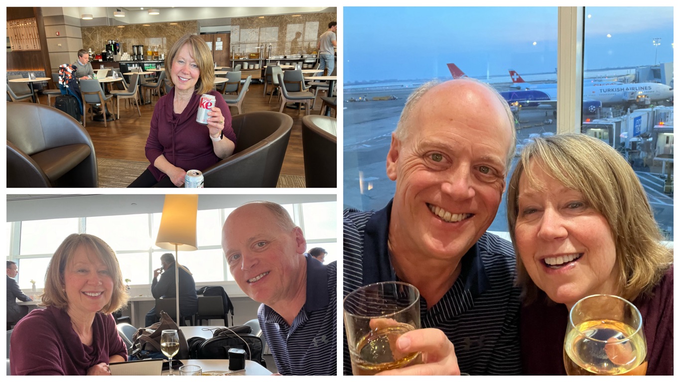 Trying out ALL the lounges at JFK. The one where Kim has a Diet Coke is the Turkish airlines lounge where they serve no alcohol (but they do have a prayer room). We didn’t last very long there… 😉