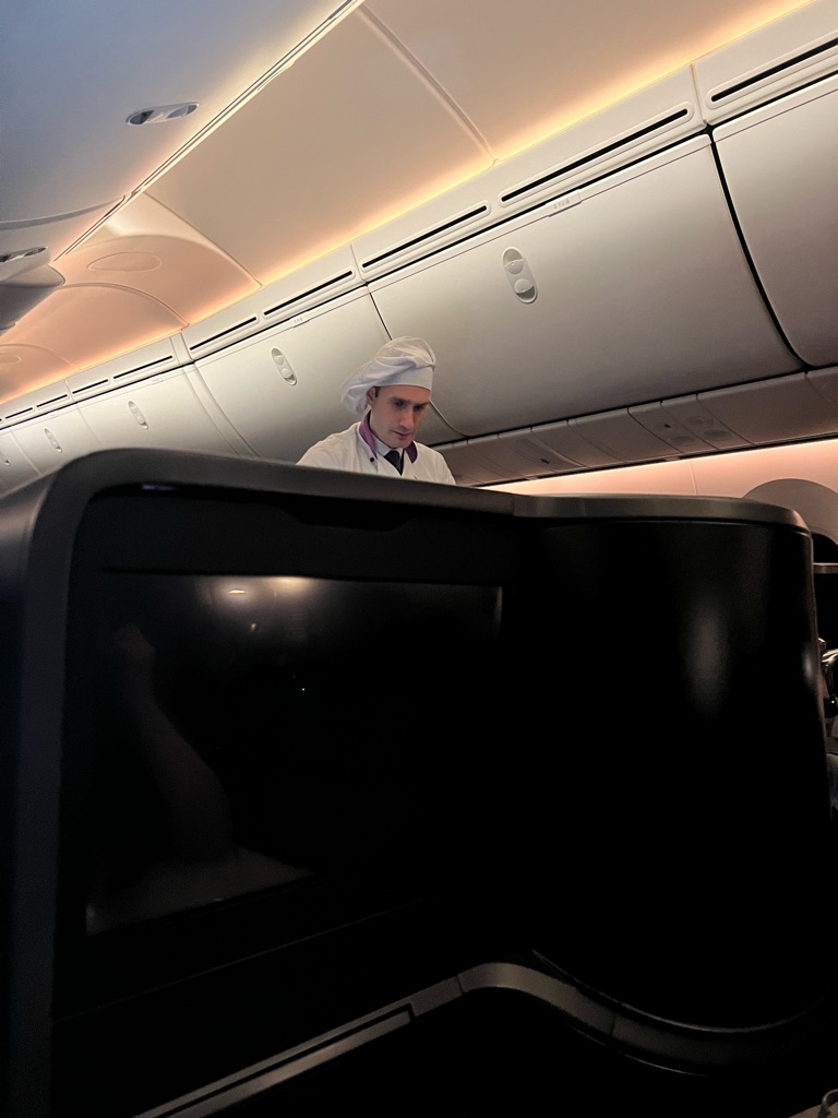 Funny story - at check in there was an Australian couple with a very active (and noisy) toddler. \240They were clearly having trouble controlling him. \240Everything put in his hand got chucked down the airport. \240Then in the club, they were chasing after him as he screamed and ran around. \240We felt so sorry for whoever was going to be seated near them! \240Well as luck would have it, they were in the two seats directly in front of us! \240He screamed constantly for the first hour, but then fell asleep for the entire rest of the flight.