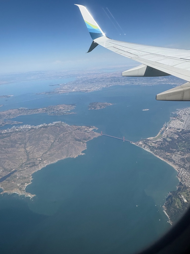 Our flight took us to San Francisco, and as we flew over the Bay Area, we were treated to a fantastic view of the Golden Gate Bridge and the shimmering skyline – a great start to our upcoming two-week road trip.