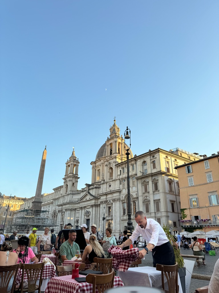 We cooled off for a bit back at the apartment and then walked over to Piazza Navona for dinner. Overlooked St Agnes church and enjoyed the cooler air as the sun was setting. The fans with light mist at most of the restaurants certainly helps.