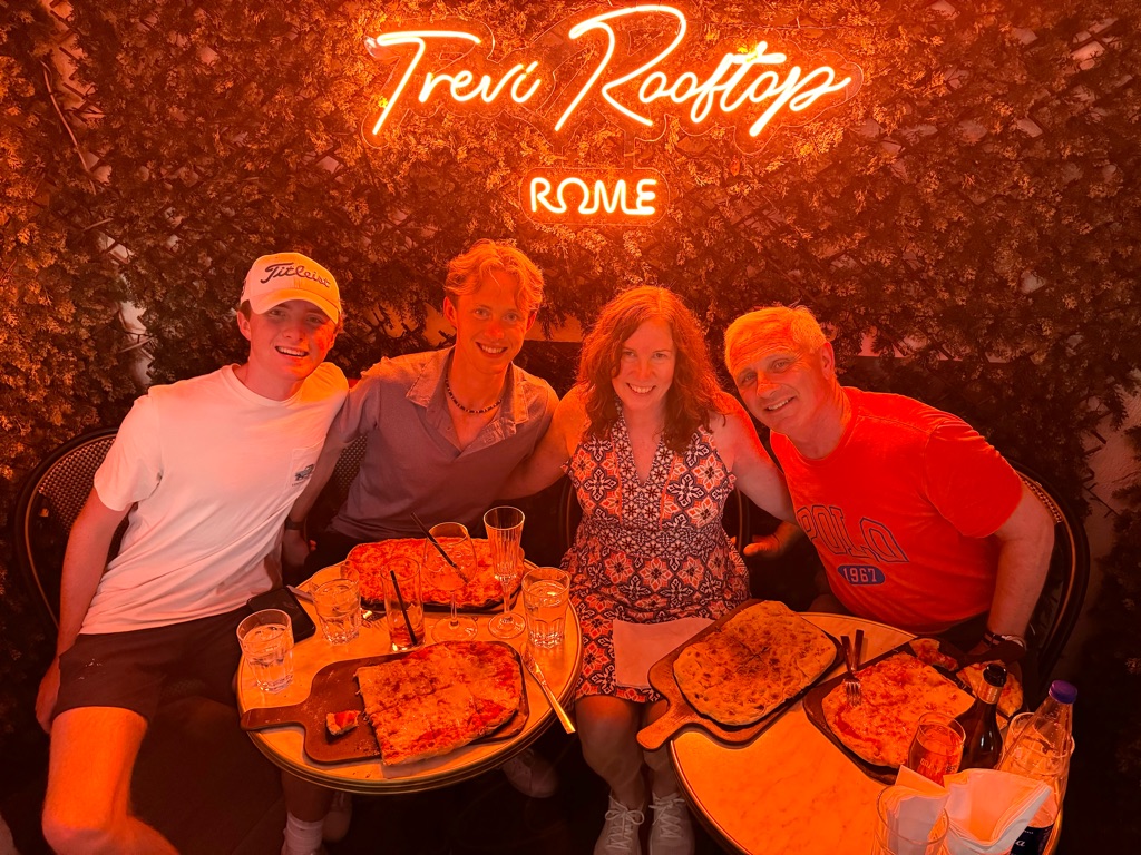 Ok, everyone have everything? \240We are off to Rome. We landed and met our driver to bring us to our apartment for the next couple of day. Great location. With a good arm and decent aim you could throw a coin from our window into the Trevi Fountain. We got settled and had a quick dinner close by.
