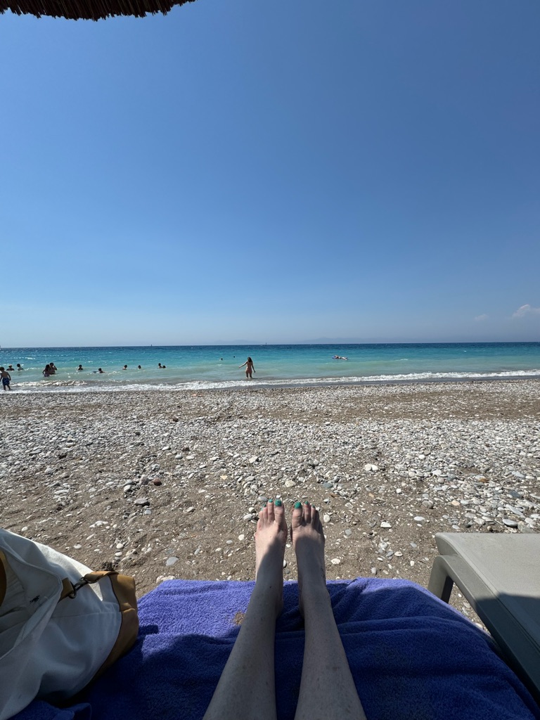 Our feet had recovered from the rocky beach incident the day prior only to be met with sand that felt like walking through a layer of fire and then on to the rocks entering the water. Pretty sure Cameron and I left a layer of skin along the way but it made us move quickly into the water. We hung out along the edge of the swimming area taking in the mountain scenery and several boats coming in and out of the area.