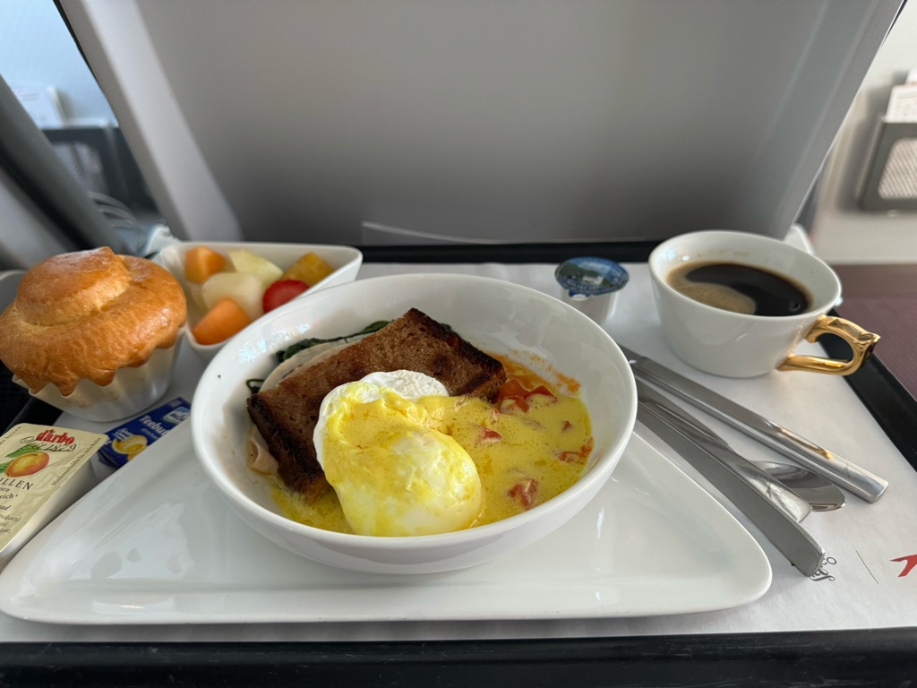 We have made our way around a few of the Star Alliance airlines this trip. Few can pull off an entirely red outfit from head to toe but these flight attendants rocked it. Thumbs up for the real breakfast complete with a real coffee cup.