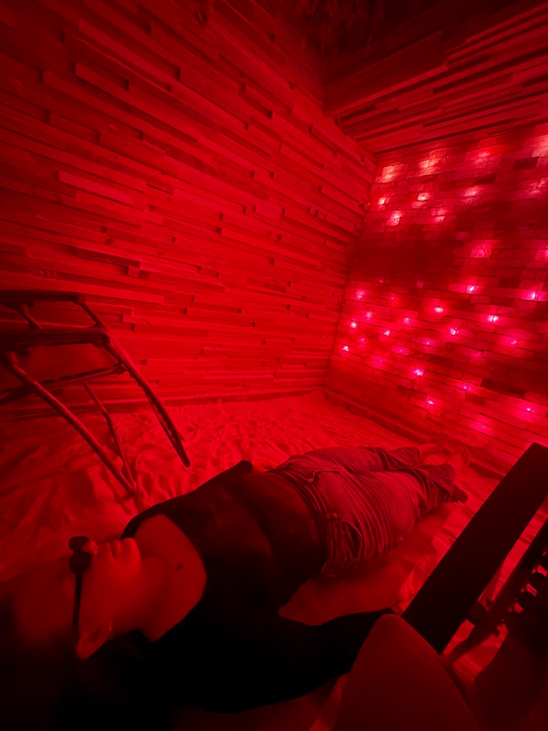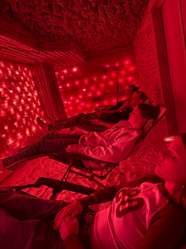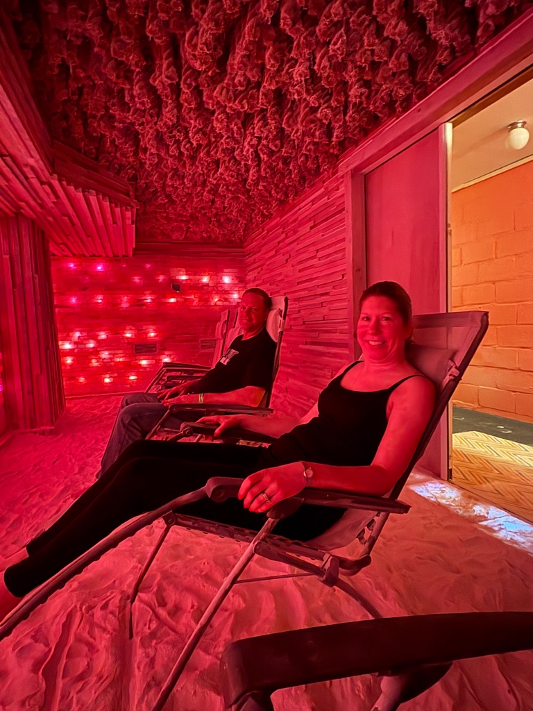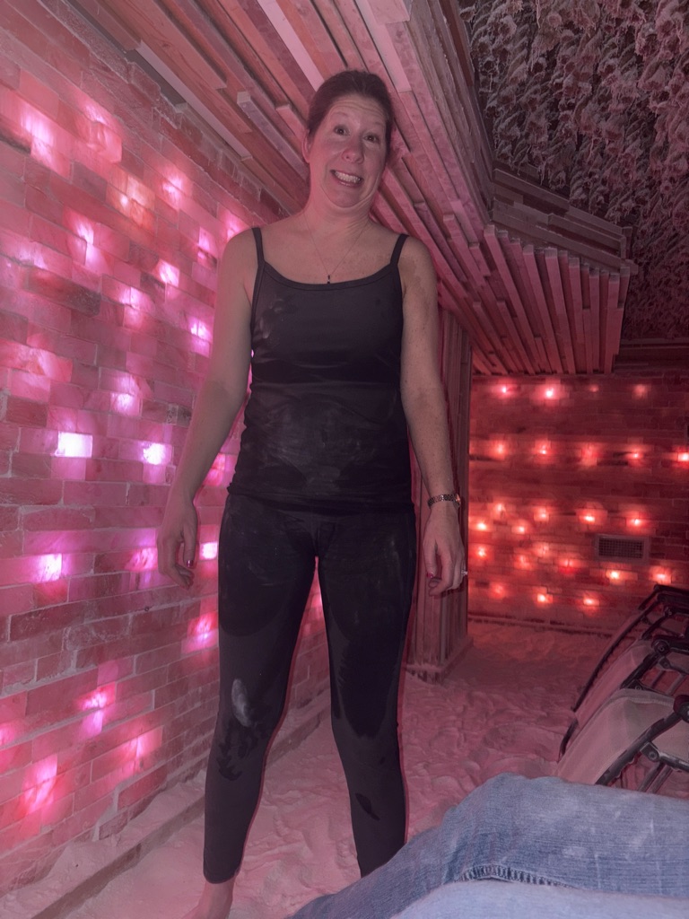 Enjoyable, meditative, quiet session that lasted 45 minutes. Salt gets pumped into the room so you are literally covered in salt and can feel it up your nose- in your mouth, etc. Lauren told us to lick our finger which yep! Tasted like salt. Supposed therapeutic benefits for congestion, cough and allergies. I think it knocked Lauren’s cold out of her! But made John worse and cough. And Jen was itchy before going to sleep at night.