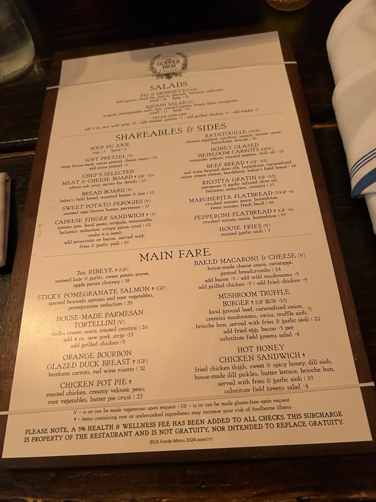 We all like the menu format- meaning paper on a wood panel secured by rubber bands. Although the rubber bands are not favored.