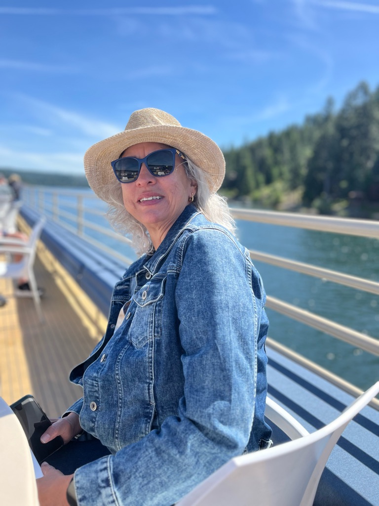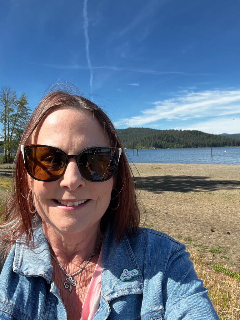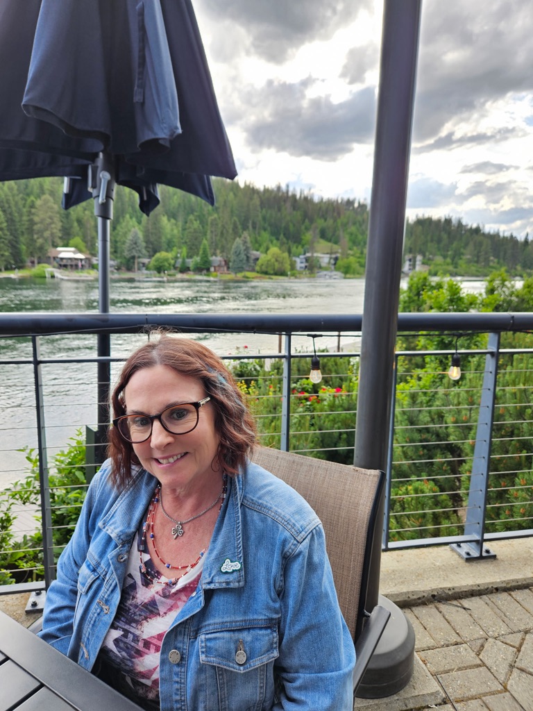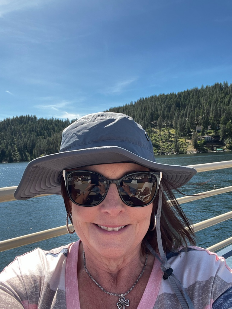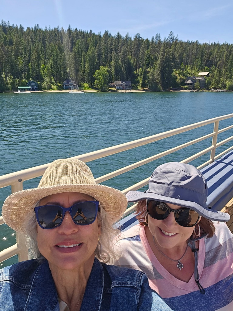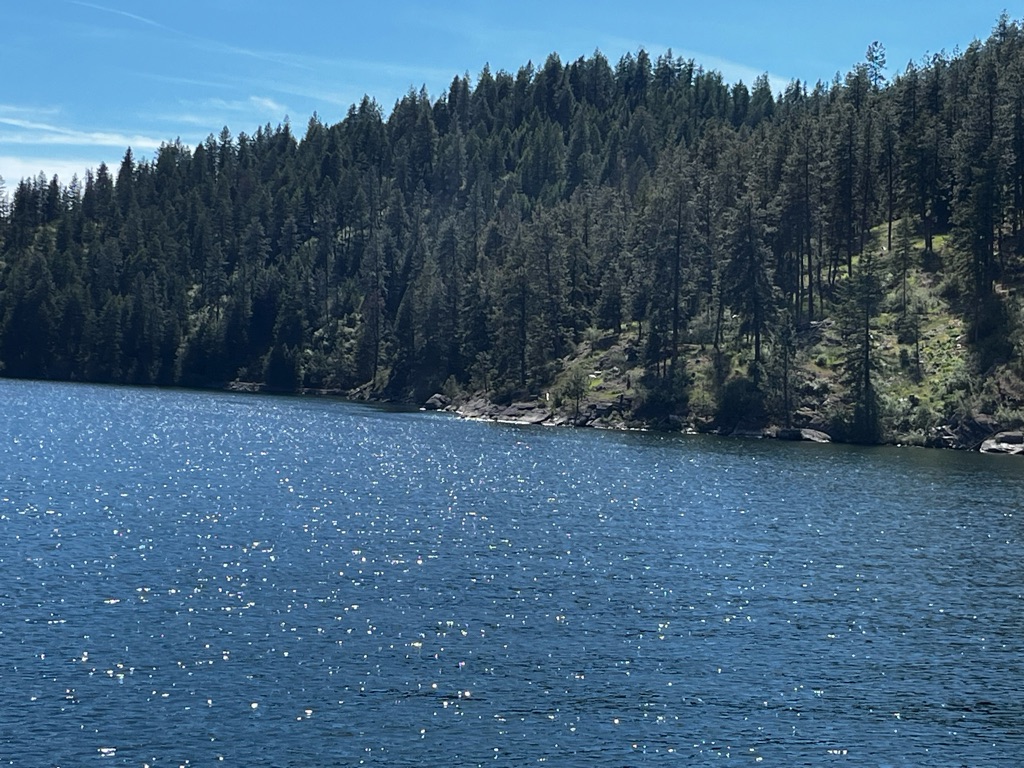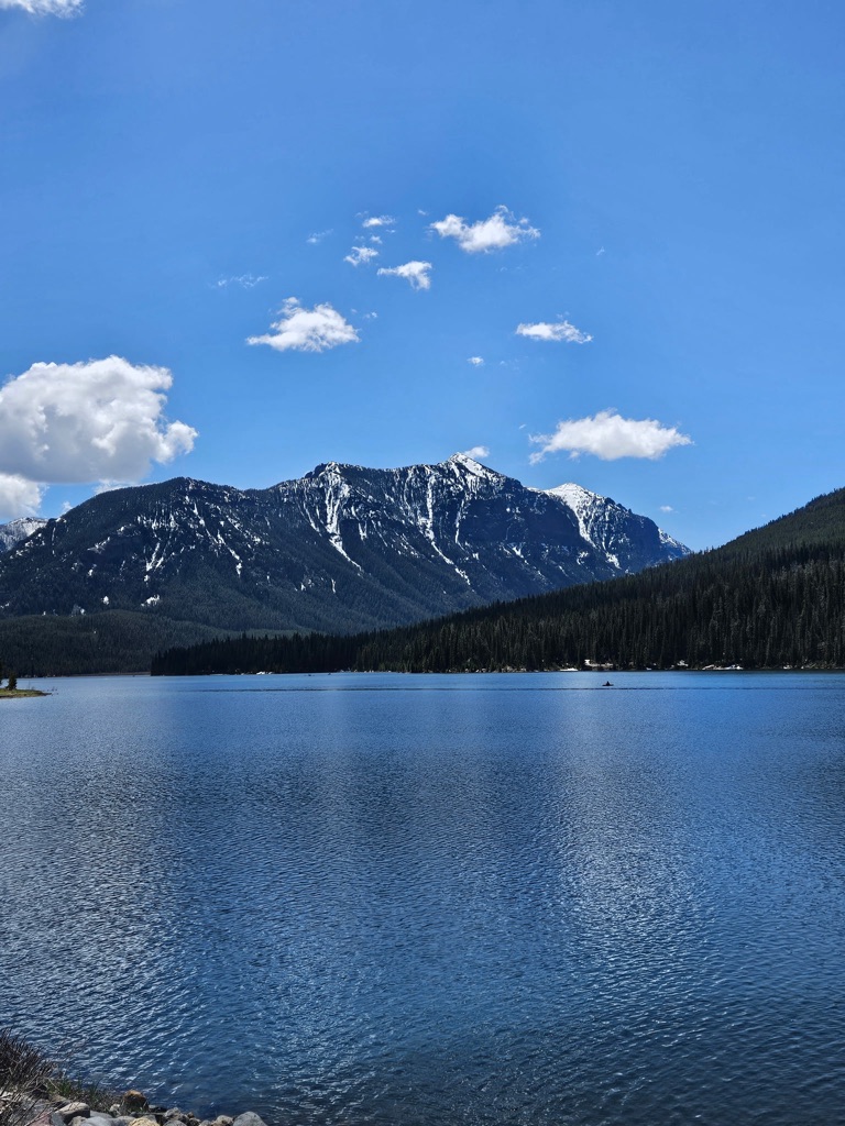 Stopped at a lake view -lake butte overlook - \240the water was so still and it reflected the mountains. Blue blue water, blue skies and fluffy clouds was stunning.
