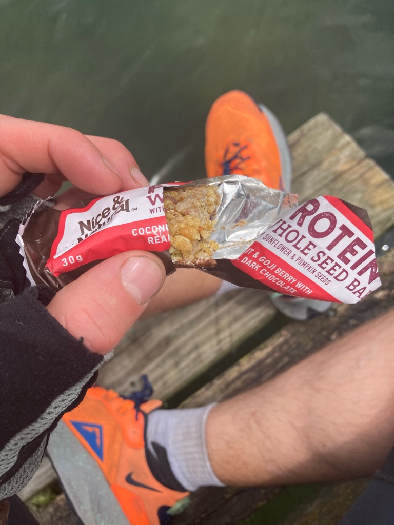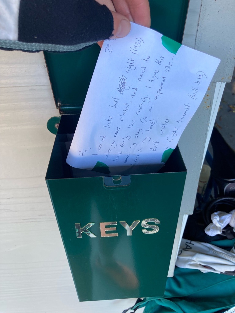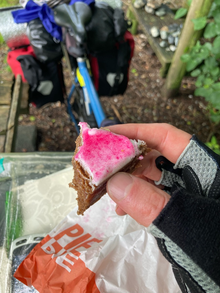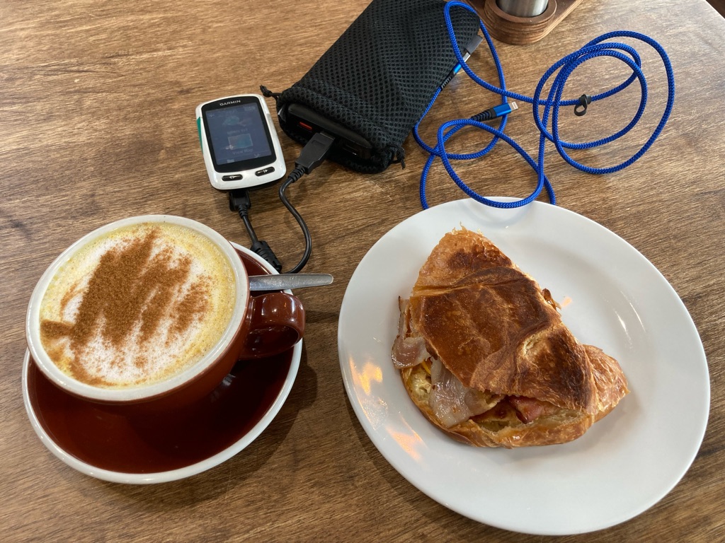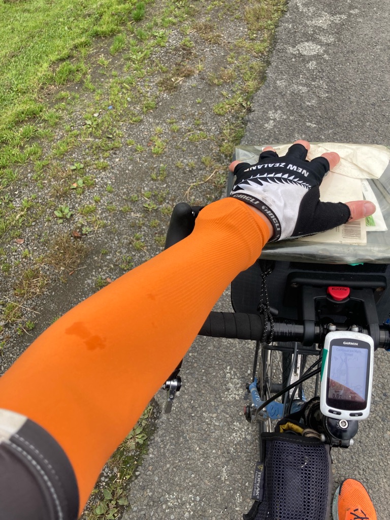 I eventually happened across ‘The Village Cafe’ which had two bathrooms. There was a conveniently placed bike rack outside too. Perfect. I locked the bike up, and got my first aid kit and flannel out of my kit - I’ll be needing those! I decided to put the rain jacket on, so that I looked more presentable by covering up my muddy, sweaty T-shirt! Inside, there weren’t any plug sockets so I put the GPS and my phone on charge with the power brick. The food looked nice, and I went to order - but they were closing at 2pm and weren’t serving. I order a ‘healthy banana and chocolate protein shake’ which seeme like a good recovery option. It took a while to prepare, and I had only got 15 minutes left to clean up! I got into the bathroom, which was helpfully spacious and had a liquid soap dispenser, and gave my legs a good scrub with the flannel. I felt like I wouldn’t have enough time to finish the job before closing time, so tidied up, collected my kit and headed outside back to the bike. I gave my cuts and grazes a good clean with some antiseptic wipes, and put some plasters on. Bit of an odd look for the high street, but needs must!