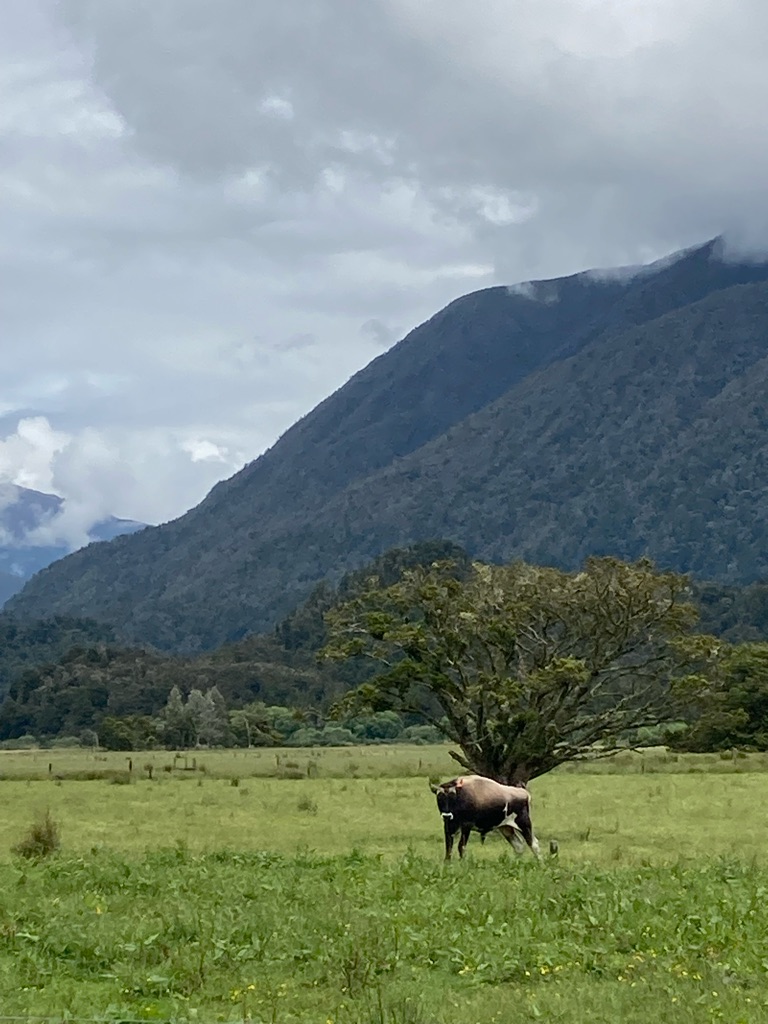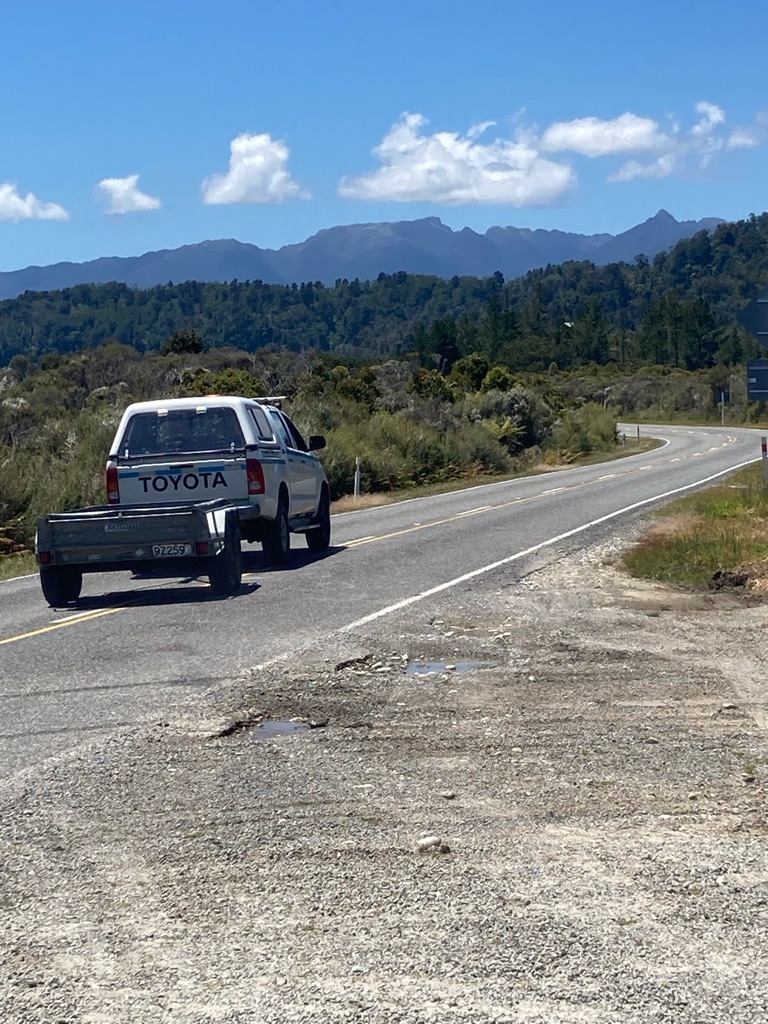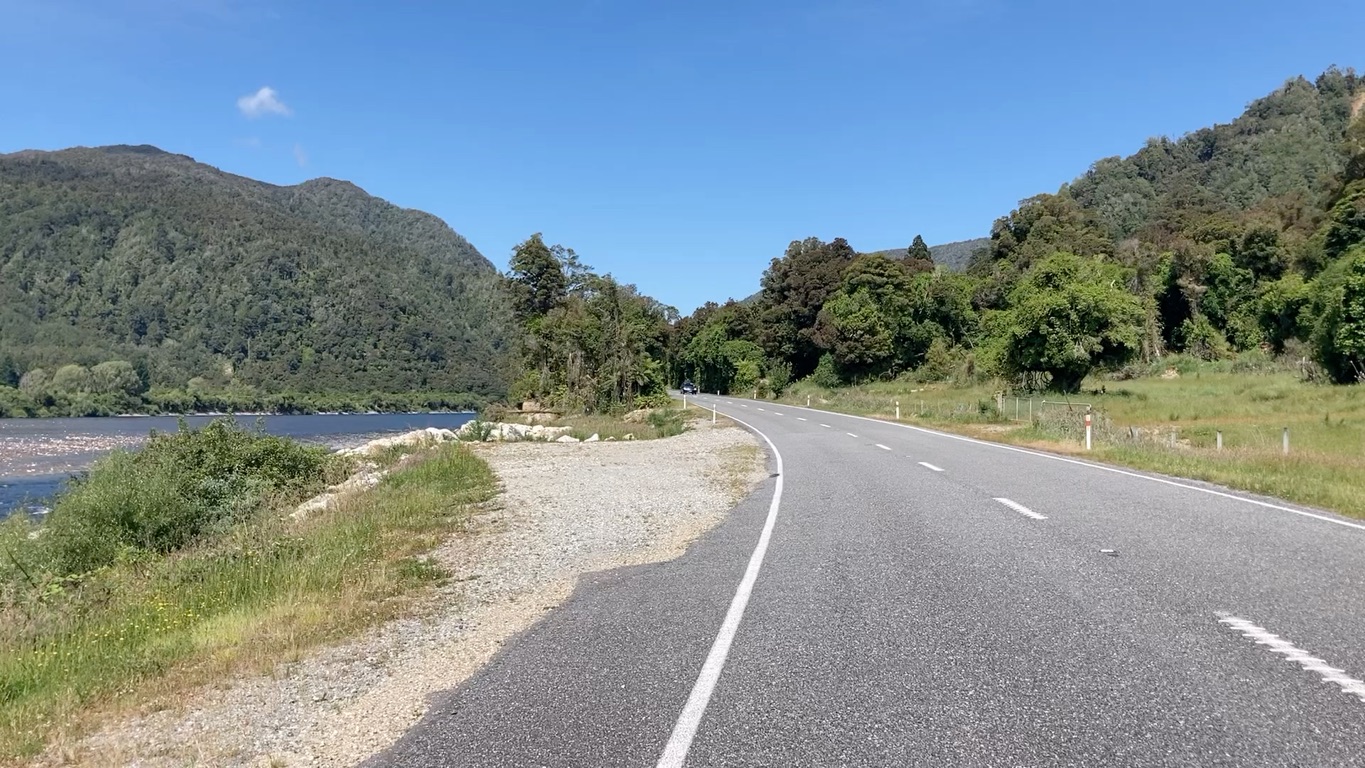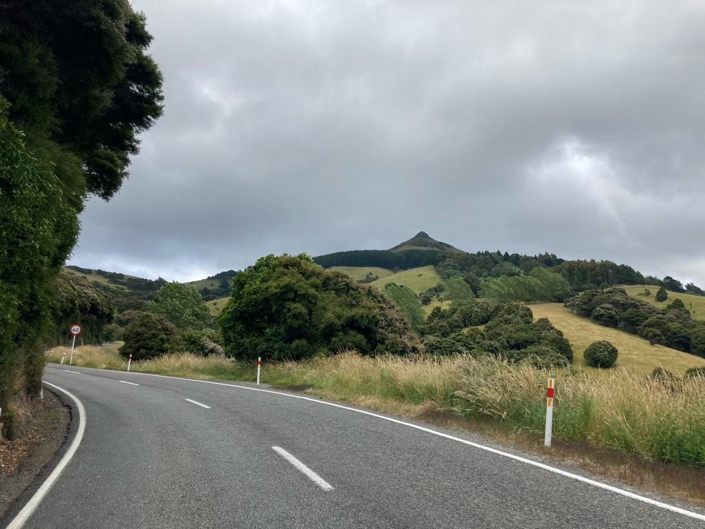 At one point, in contrast to the shy Pukeke birds earlier, a wader with black feathers and an incredibly long red beak flies towards me, chases me and then stands on then road in front of the bike. No idea why (territorial I guess?), but it makes for some good pictures. Googling later, I think it was probably a ‘variable oystercatcher’. According to Wikipedia, its Maori name is torea-pango, and they are (unsurprisingly) also known as 'red bills'.