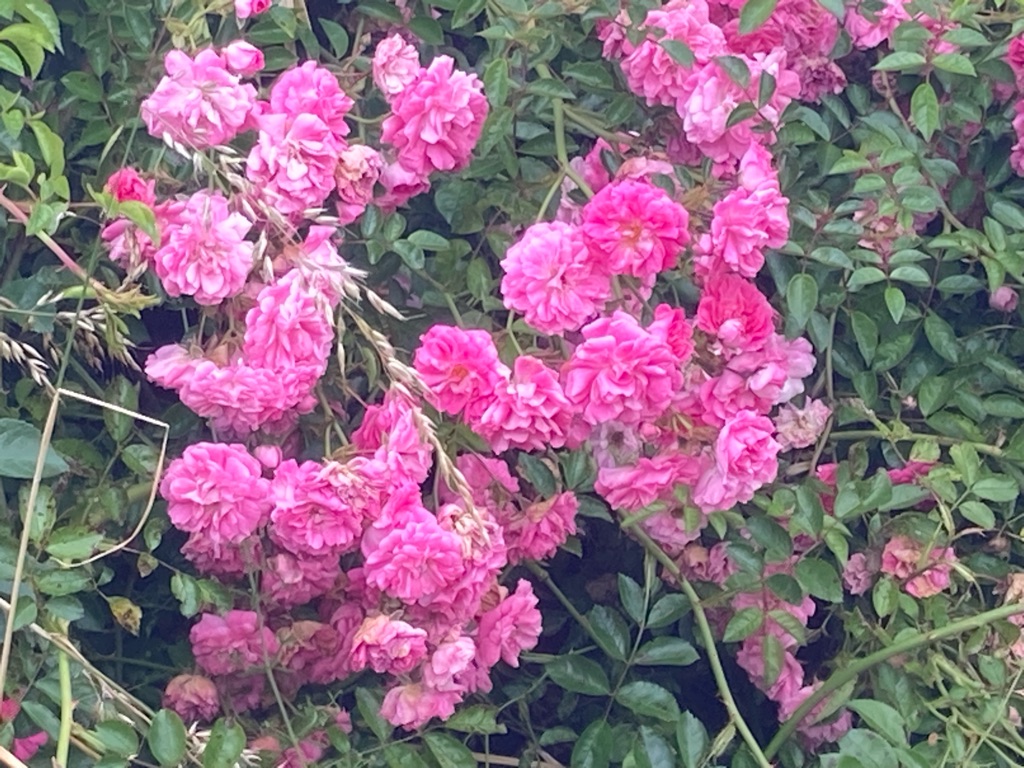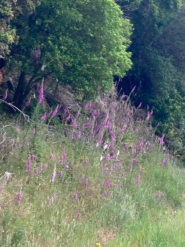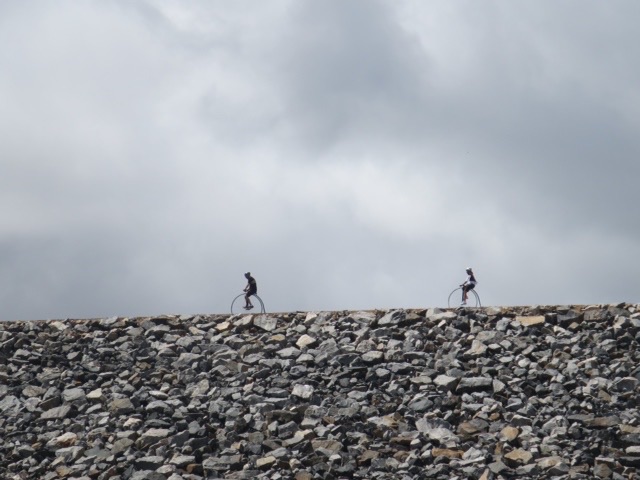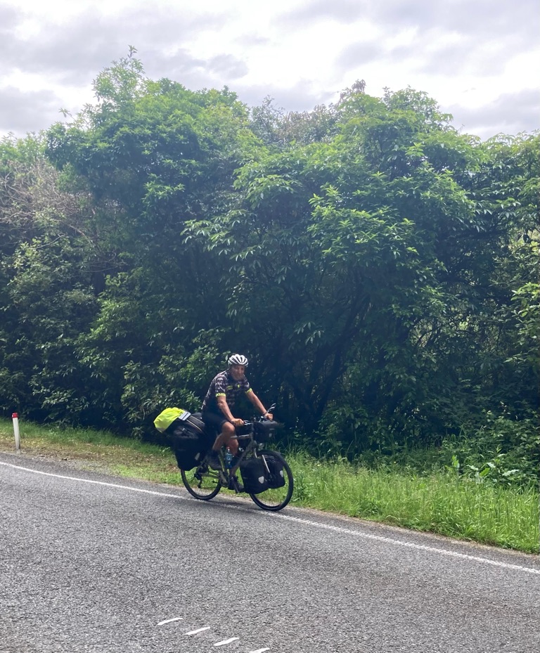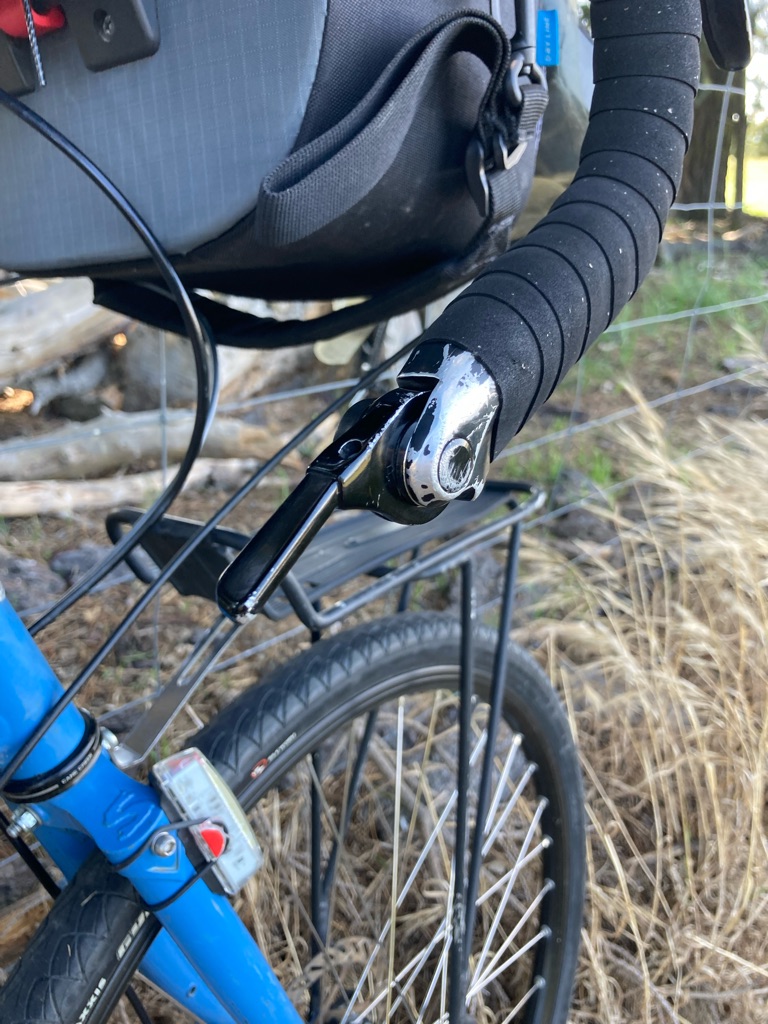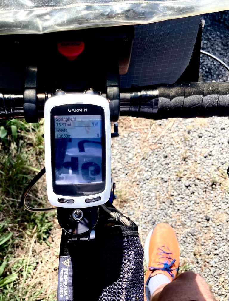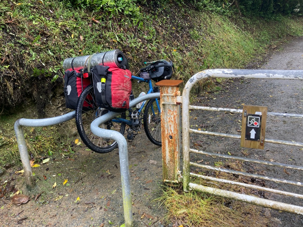 It became very steep, and very hard work. I had to get off and push the bike, and grip the brakes whilst paused to stop it rolling backwards. I eventually worked out that if I pushed it from the left side, I could have my left hand on the lever that operated the back brake, and my right hand gripping the seatpost, pulling and lifting the bike forward and upwards. I had to keep stopping and was covered in sweat.