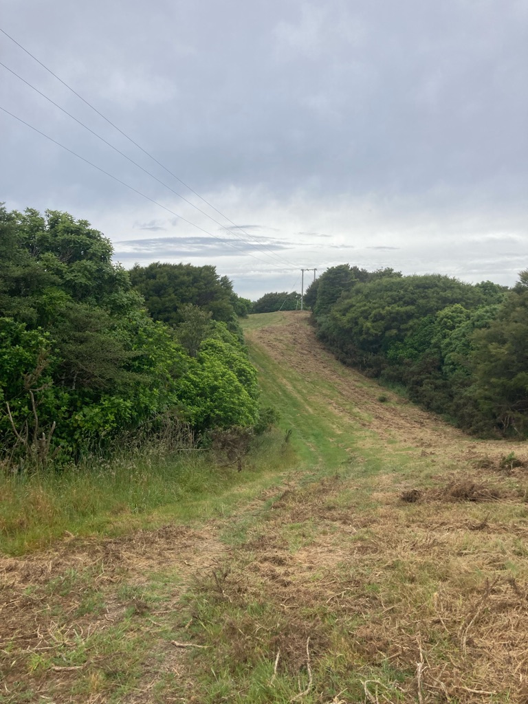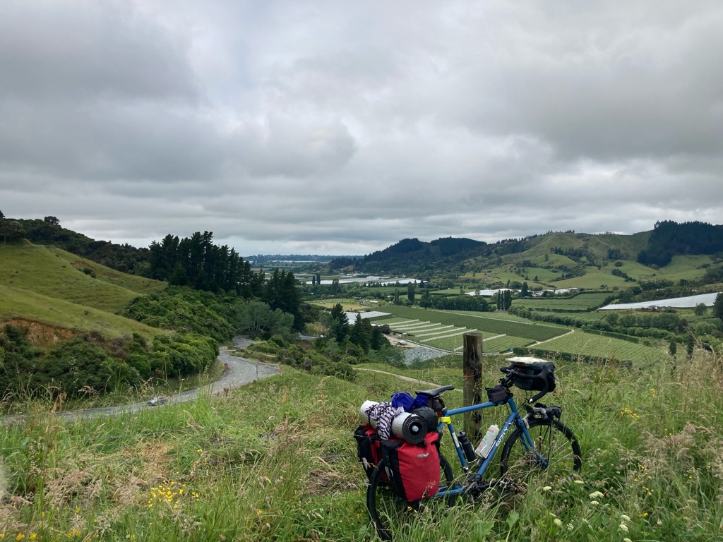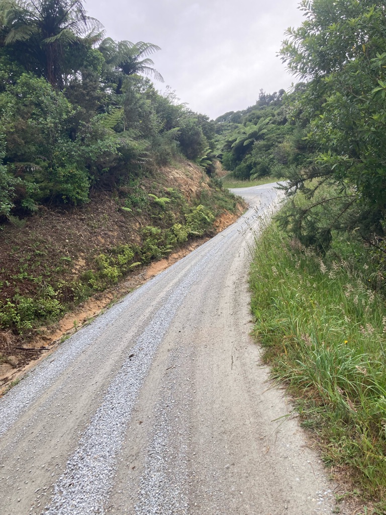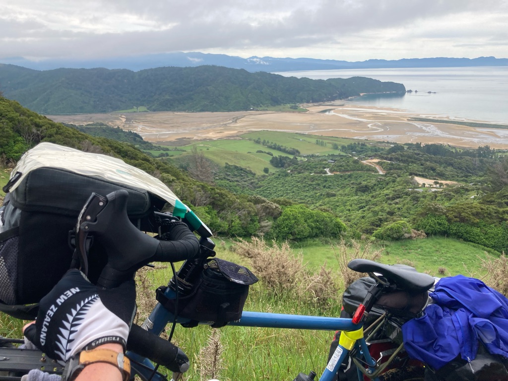 The vegetation gave out to an open field. Another good sign of finding a path, \240it must have been cleared on purpose. I must be near the top now, and there’d be a proper track. The clearing allowed great views back down to Wainui inlet, allowing me to get a couple of nice photos, during pauses as I pulled the bike up.