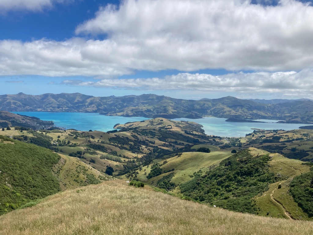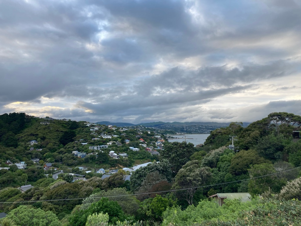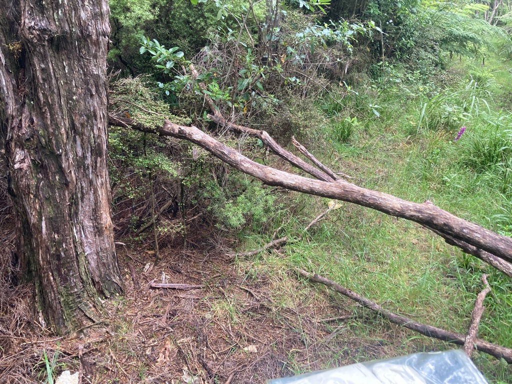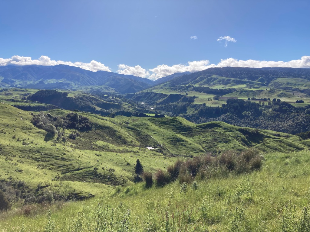 The vegetation gave out to an open field. Another good sign of finding a path, \240it must have been cleared on purpose. I must be near the top now, and there’d be a proper track. The clearing allowed great views back down to Wainui inlet, allowing me to get a couple of nice photos, during pauses as I pulled the bike up.