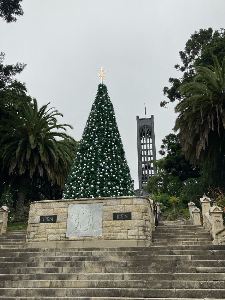 I checked out the hostel’s kitchen to see what the facilities were like. Unlike the Big10 the other day, there were utensils and cutlery as well as hobs, an oven and a fridge. They also had free fresh bread! I headed into town, to get a proper look at the cathedral that I’d seen on the way in, and to find a supermarket to buy things for the extravagant dinner I had in mind. Good to see a Christmas tree, amusingly (to me) flanked by palm trees!