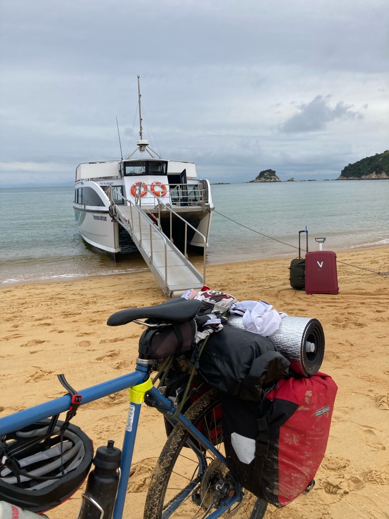 I realised that I looked like a state - there was mud and bits of vegetation stuck to me, and I had grazed and bleeding legs. I tried to have a cleanup in the boat’s toilet, but to little effect - that mud&sand was a sticky combination. I also had a look at the bike’s gears - I was worried about why they had suddenly locked in my final little ride. Had I damaged the derailleur or something by crashing the bike down that hill? I doubted there’d be a bike shop in Kaiteriteri if it needed repairs. Perhaps in Motukea - that’d be a 7 or 8 mile walk pushing the bike though, which wasn’t a great prospect. It looked like the chain had slipped off the smallest wheel on then cassette, so I pulled it back into place. That was not a permanent problem, if that’s all it was. I’d have to see how it rode when I was back on dry land…