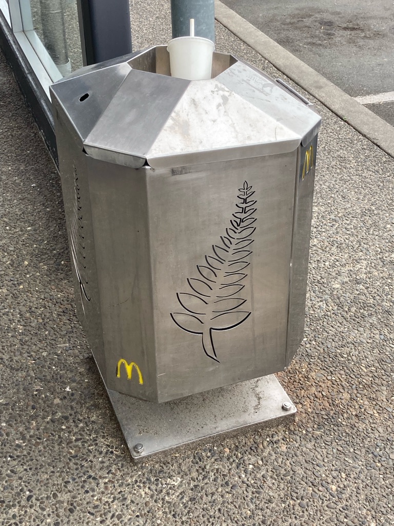 It was about 30 miles to Nelson from here. I’m feeling fresh legged - literally and figuratively, since they’ve just had a good clean, and also a good rest sitting on the ferry and then in the cafe. Might as well crack on then! As I leave Motueka, I see a McDonalds. I’d quite like a coffee to wake me up a bit - McDonalds might be a quick and cheap option. Sadly, I discover the coffees are nearly $5, the same price as nice ones in proper coffee shops here. I can’t bring myself to buy one - however they have ice creams for $2.50 so opt for one of those. The NZ fern leaf design on their bins also catches my eye!