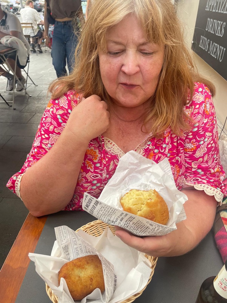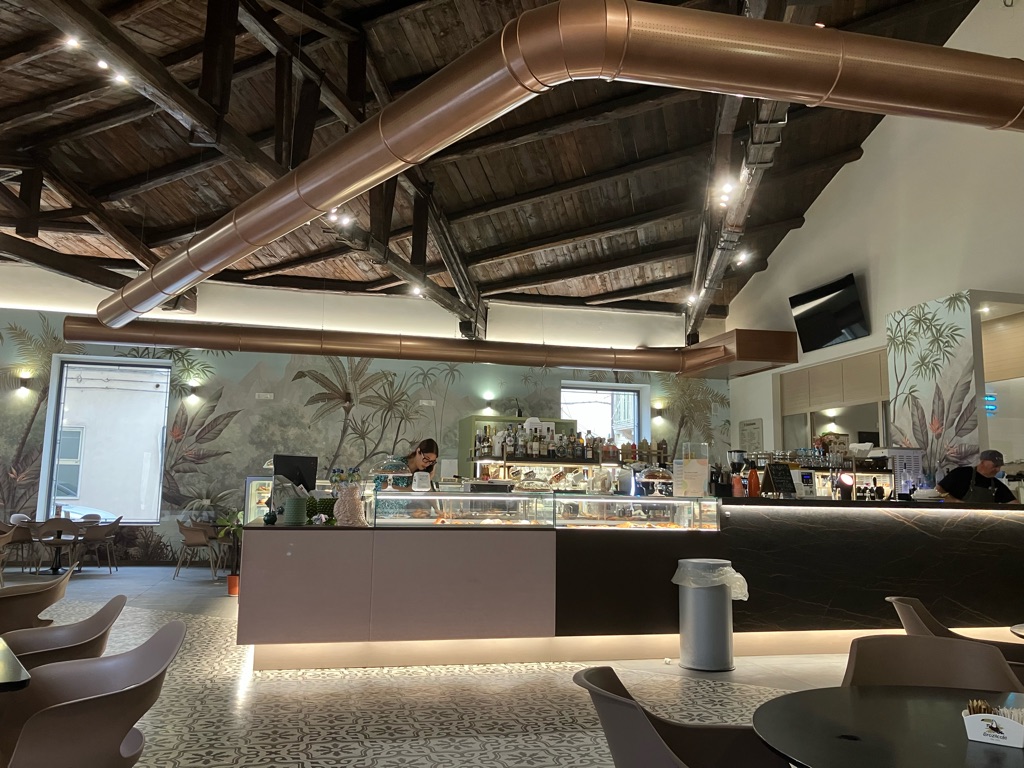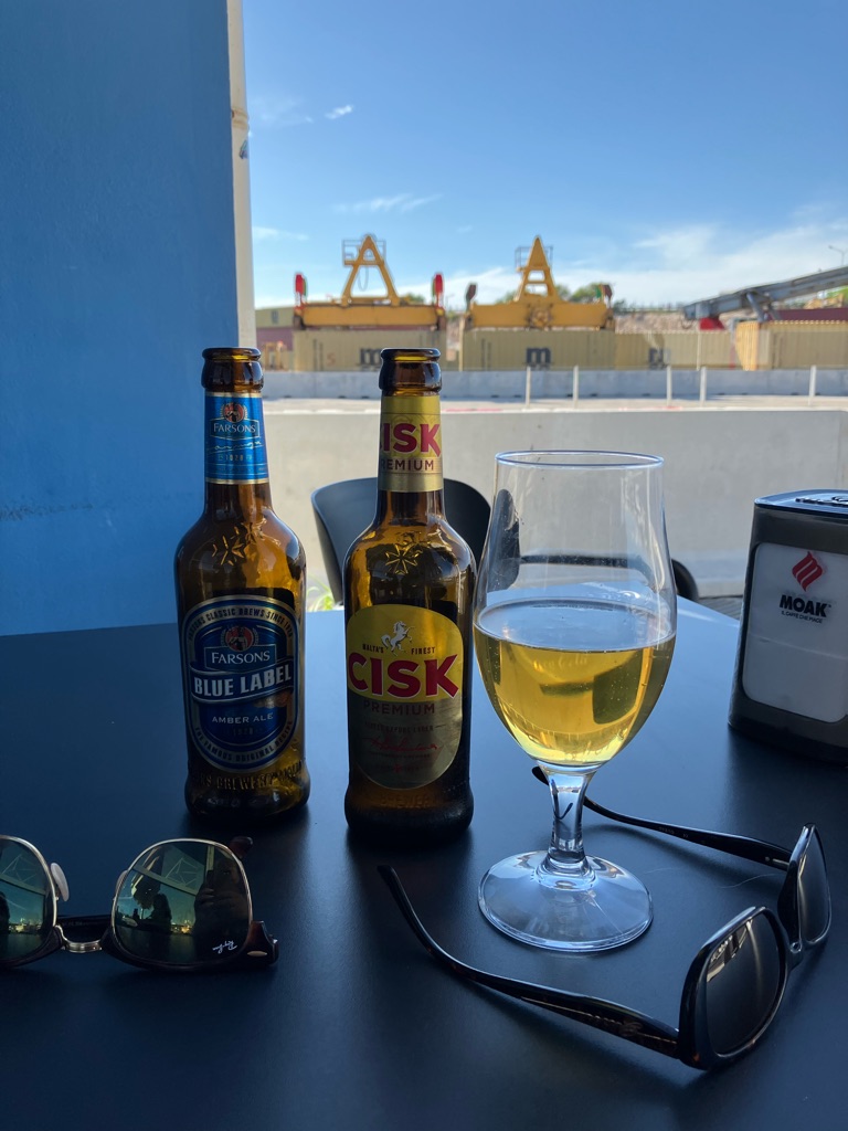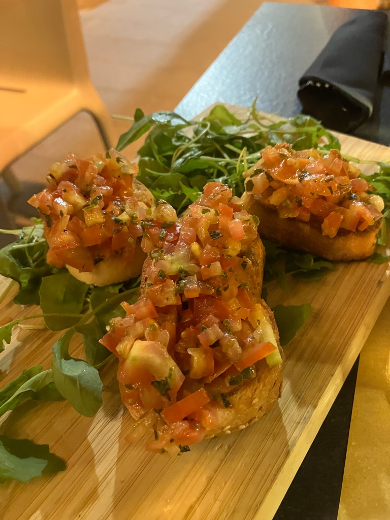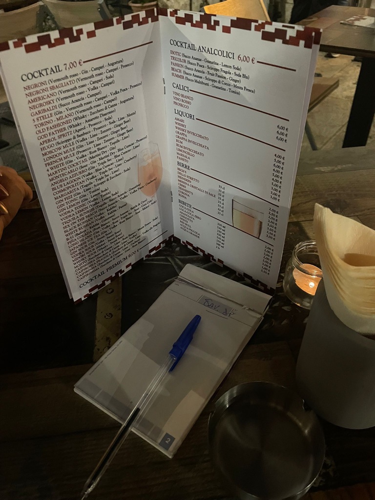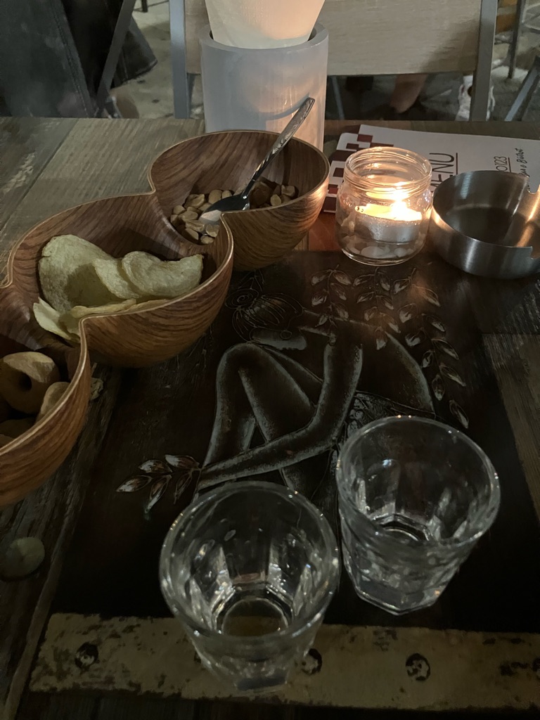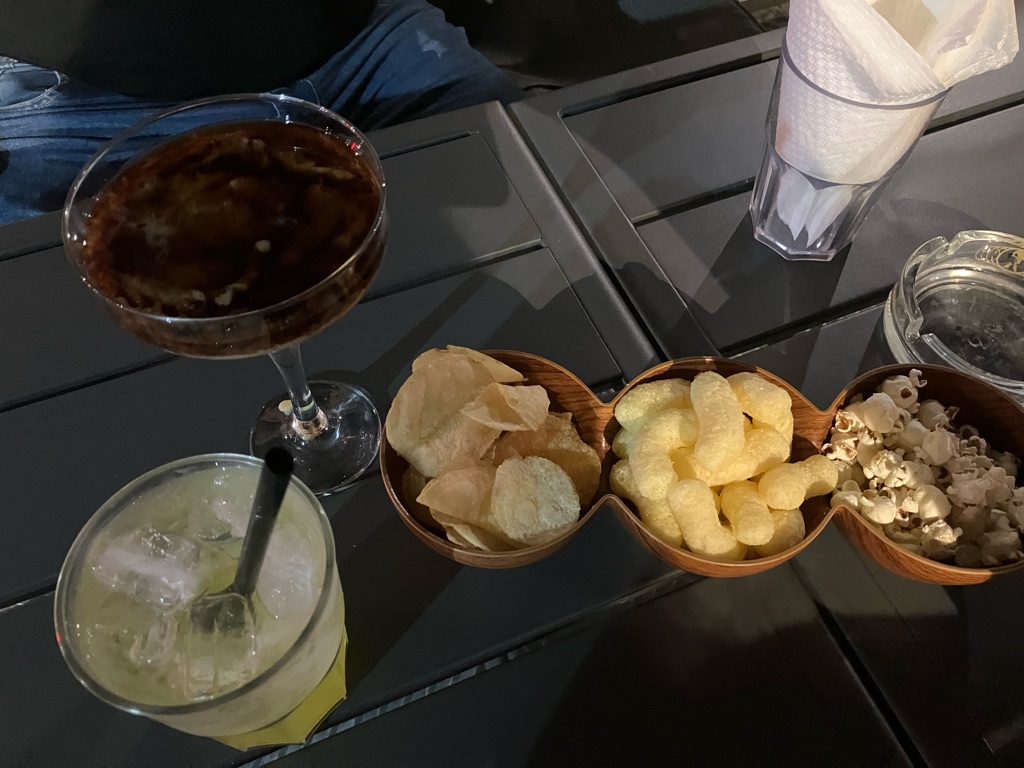 En muistanutkaan, mutta täällä tulee aina juoman kylkeen jotain pientä naposteltavaa. Vähintään sipsejä ja pähkinöitä, usein pitsan tai leivän paloja. Herkkuja ja maksuttomia.