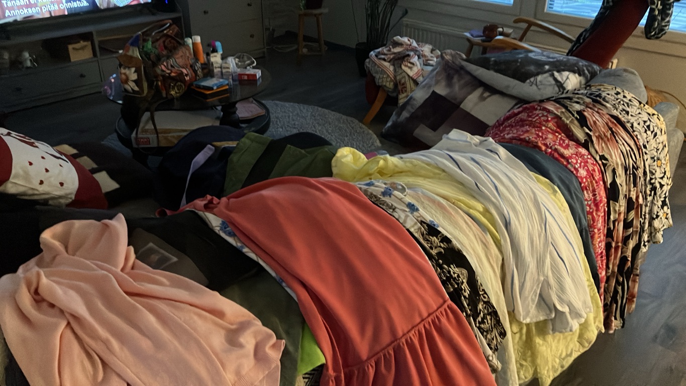 Tässä viikkoa ennen pyykkiä pestessä \240keräsin kamoja kasaan sohvan päälle. Vain mekkoja mukaan…..
