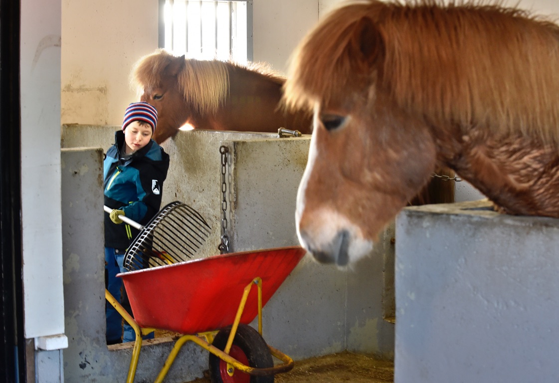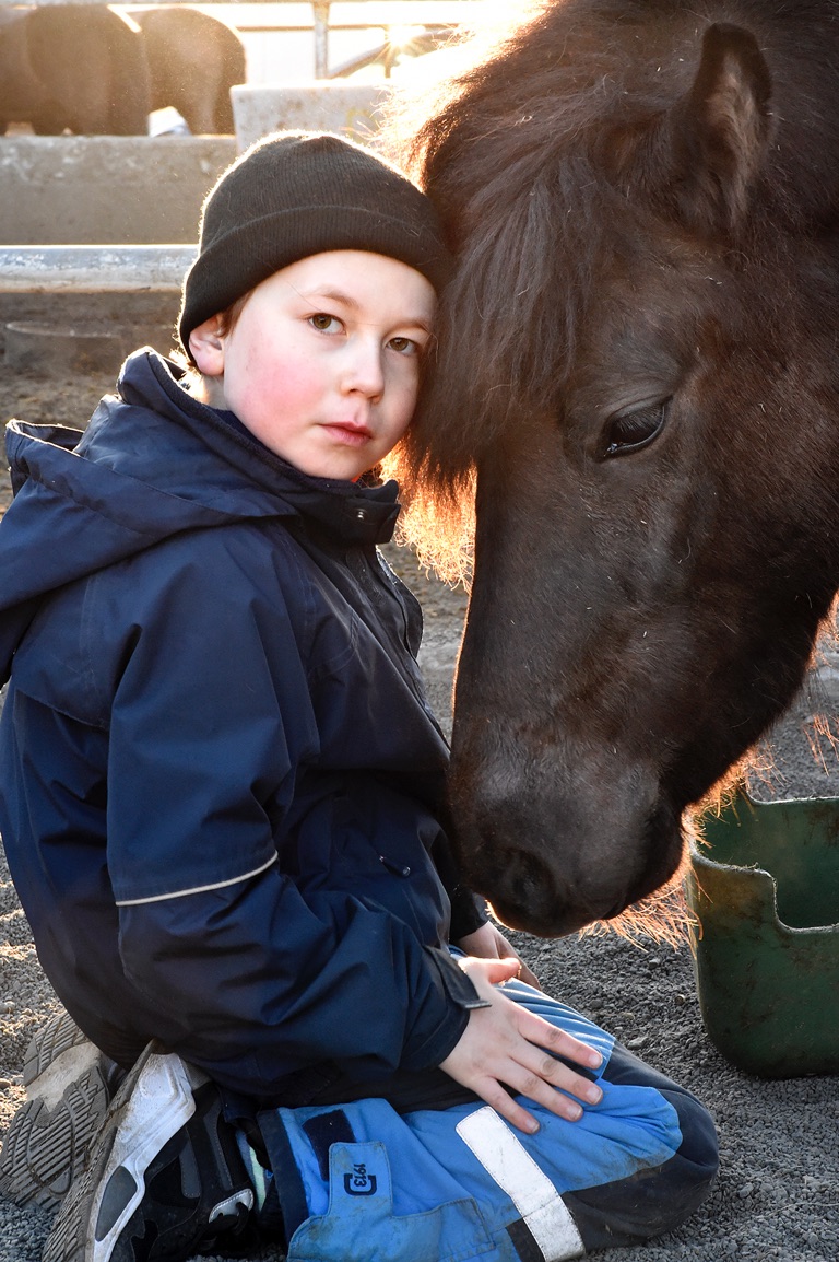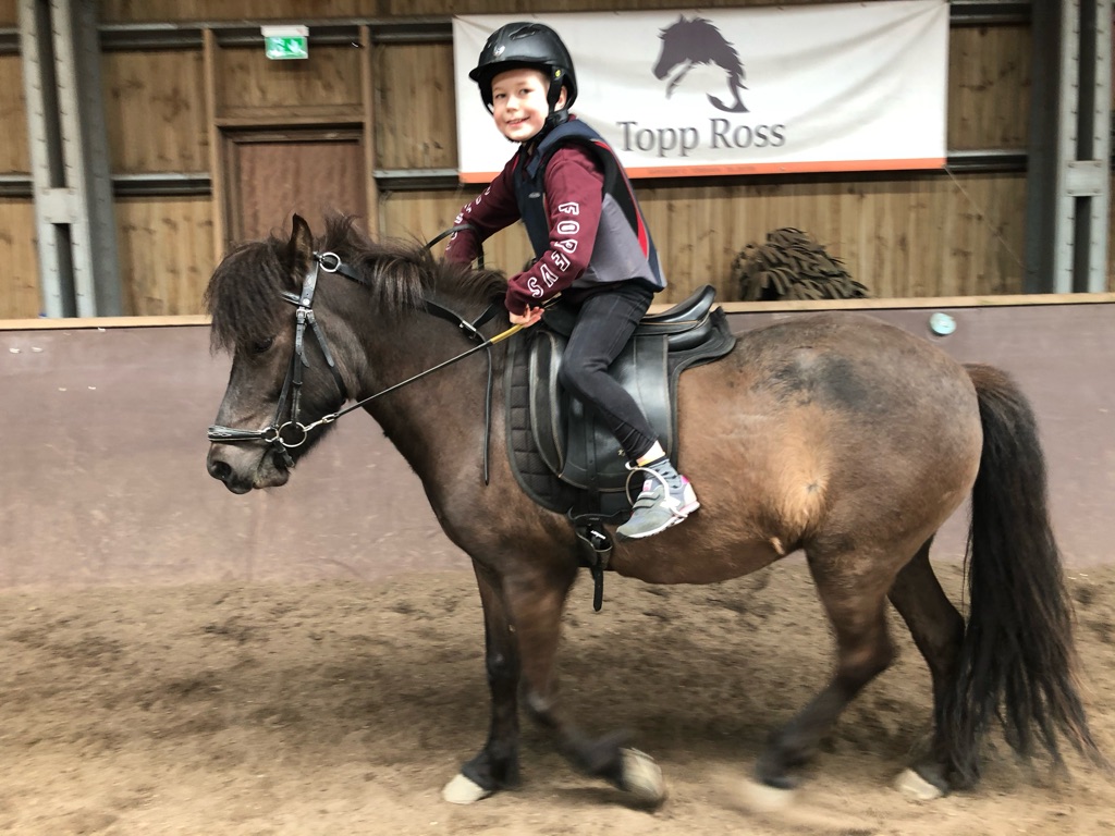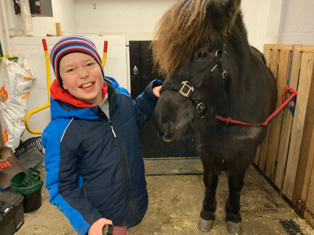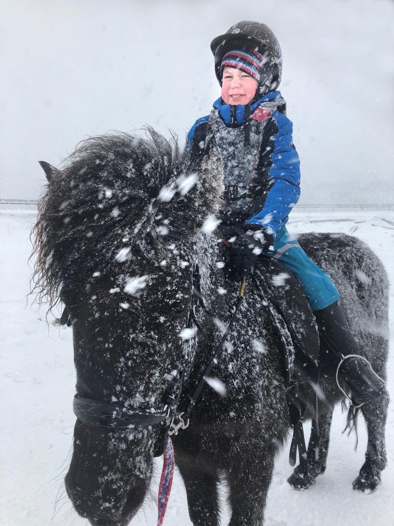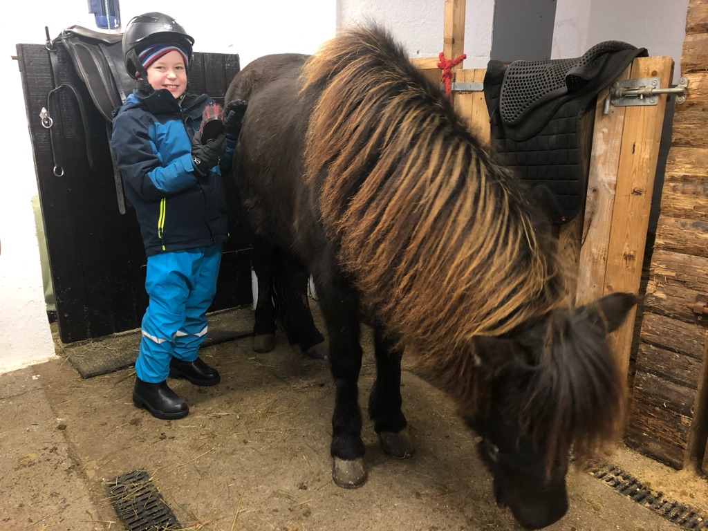 Speciellt under veckans första ridtur märkte jag stelheten. Jag gav Maynard ett ridspö så han kunde lära sig att använda den själv på Ösk men han satt så stel att han inte ens ville öppna handen och släppa tyglarna. Var han rädd och blev stel på grund av detta? Han hade dock samma beslutsamhet och iver innan när han gjorde i ordning Ösk och satte sadel på honom. Kanske var det dumt att låta honom borsta Ösk innan som fortfarande fällde vinterpäls. Det var lerig och svårt för Ösk att springa så jag tyckte inte det var någon större ide att tvinga henne att galoppera. Dessutom ville jag att Maynard själv skulle lära sig att använda hans ben och trycka eller sparka benen mot Ösks mage.