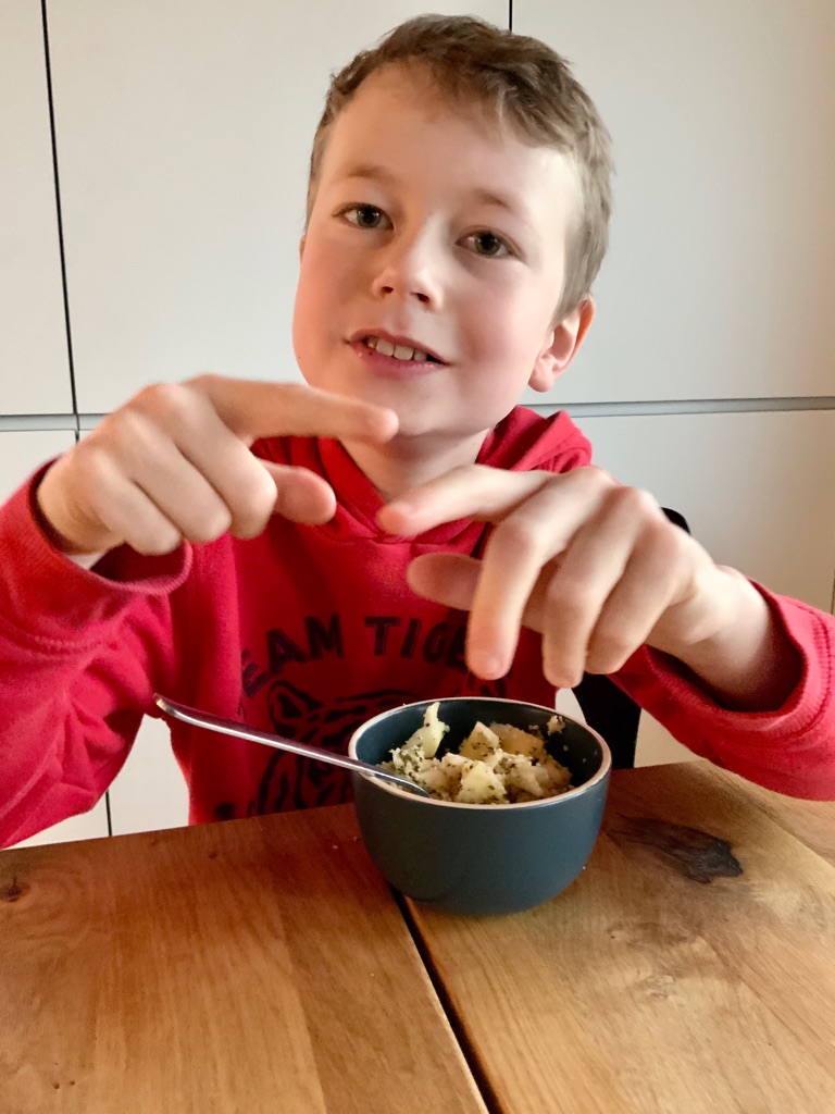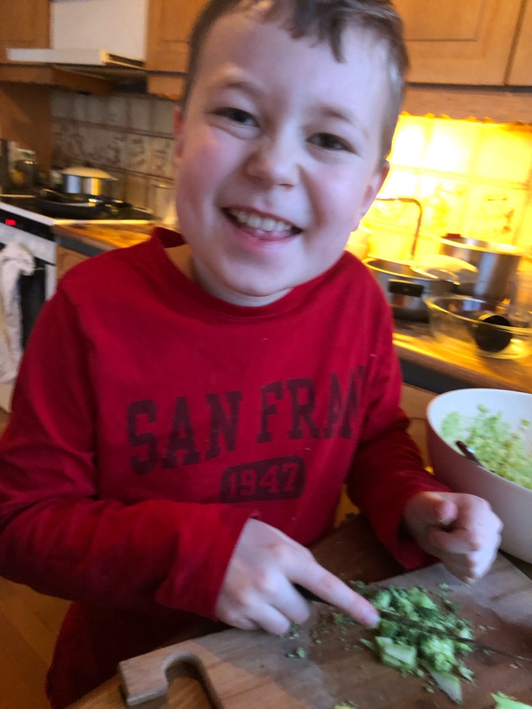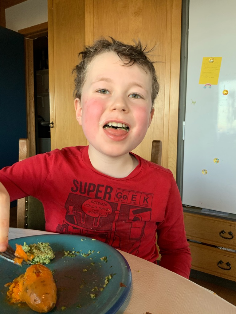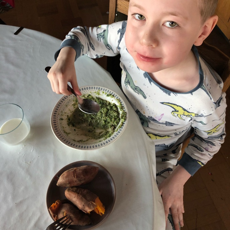 Maynard hade varit som en dröm hela eftermiddagen trots att han cravade en del. Initiativet hade ökat och han tog själv fram sötpotatis och sade att han ville göra scones. När jag lade en sötpotatis tillbaka i kylen märkte jag efter att ha gjort ett snabbt ärende att han själv hämtat den och lagt iden med de andra i grytan. Jag skrattade och tänkte för mig att det kanske var lika bra att den också blev uppäten.